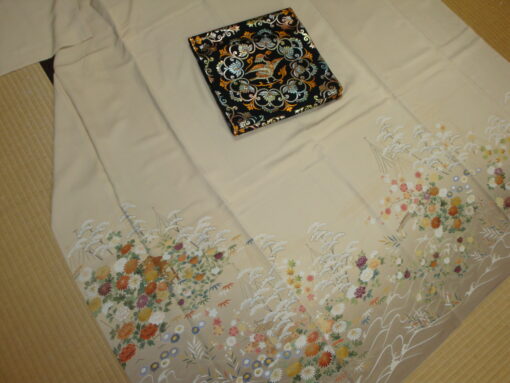 落ち着いた秋草模様の色留袖。叙勲用に誂えた品物。帯は、龍村の正倉院花喰鳥文。