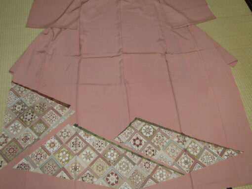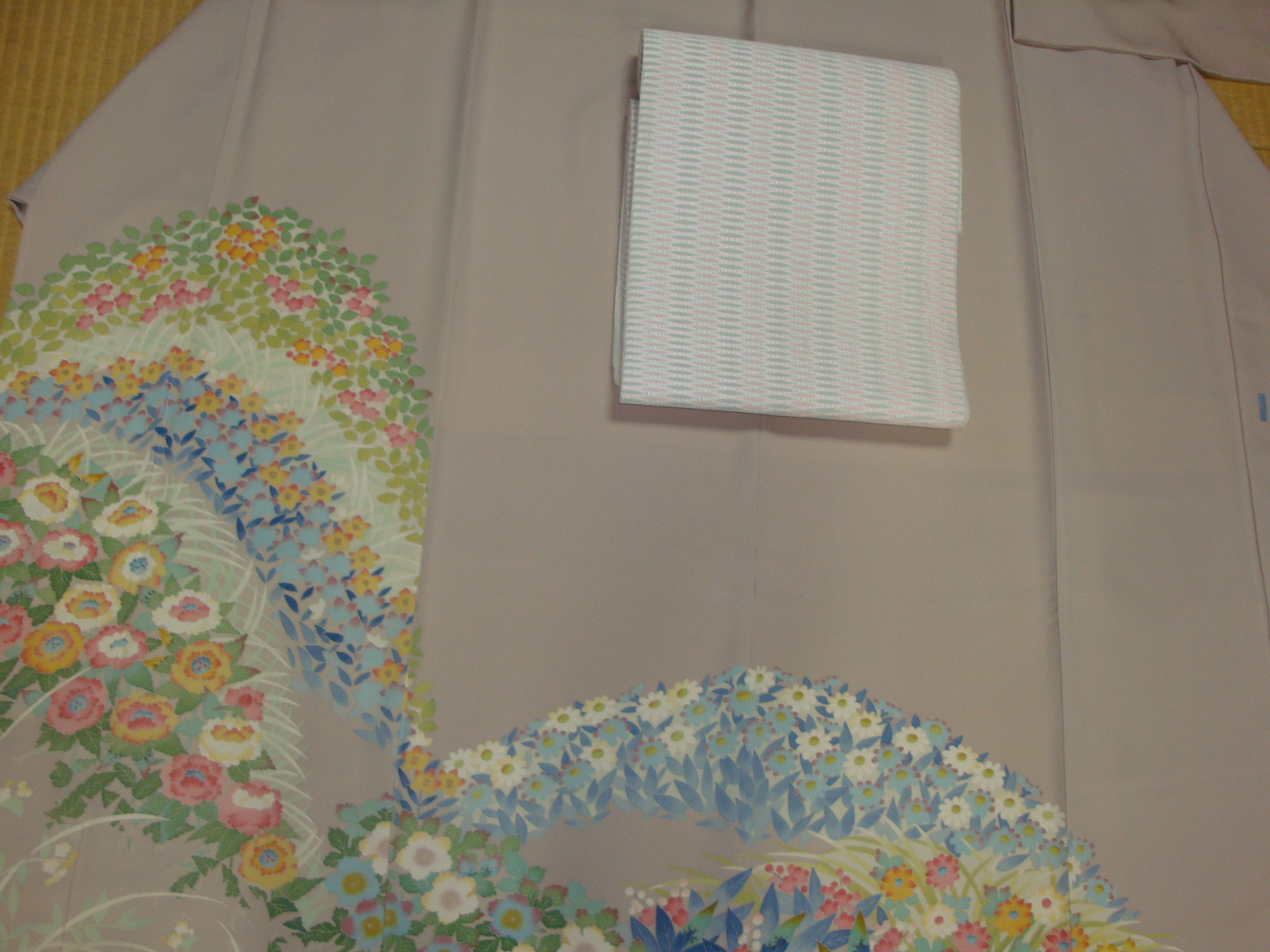 色留袖から紋を全て外すと言うことになると、そのキモノは何になるのか。模様あしらいが裾だけなので、これは留袖形式になる。しかし紋が付いていないので、留袖の役割は果たしていない。それでは、何になるのか。訪問着の場合、模様は裾と袖、そして胸にも施され、中には模様全体が繋がって、総柄のように見える品物もある。また反物の状態で加工される付下げは、その多くが訪問着に比べて模様の嵩が少なく、あっさりとした柄行きの品物が多い。いずれにせよ、紋の無い裾模様だけのキモノは、その模様形式だけを考えれば、現在あるキモノアイテムのどこにも属さない。