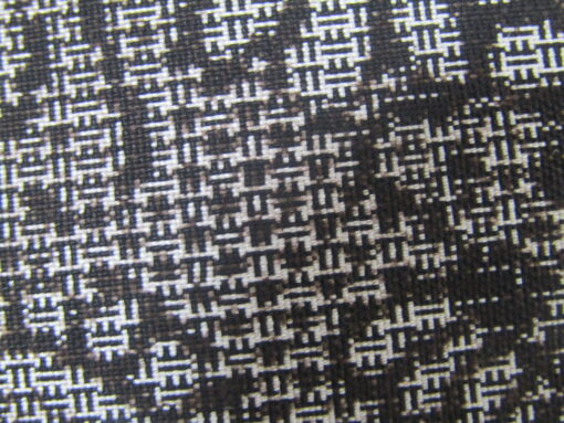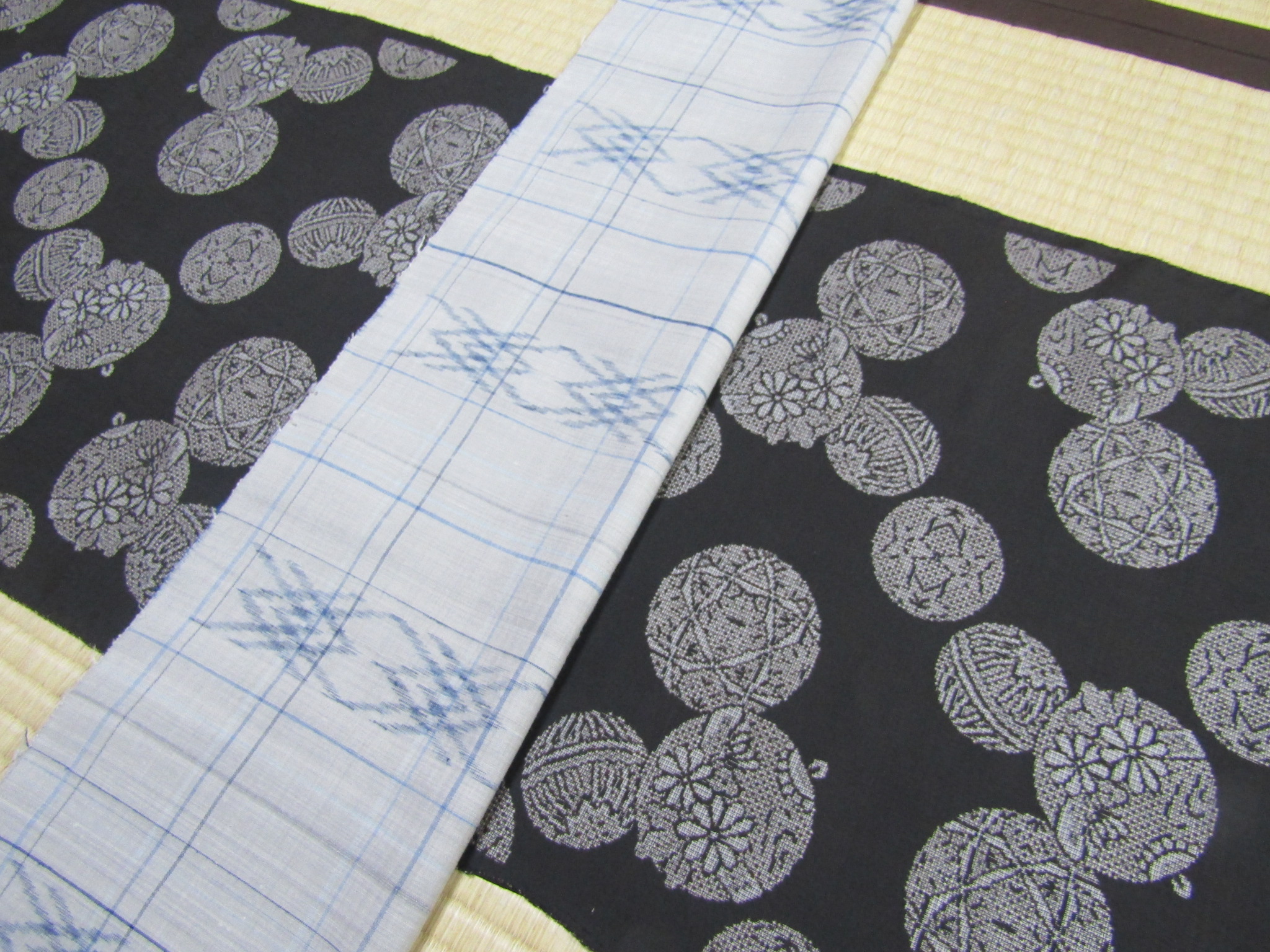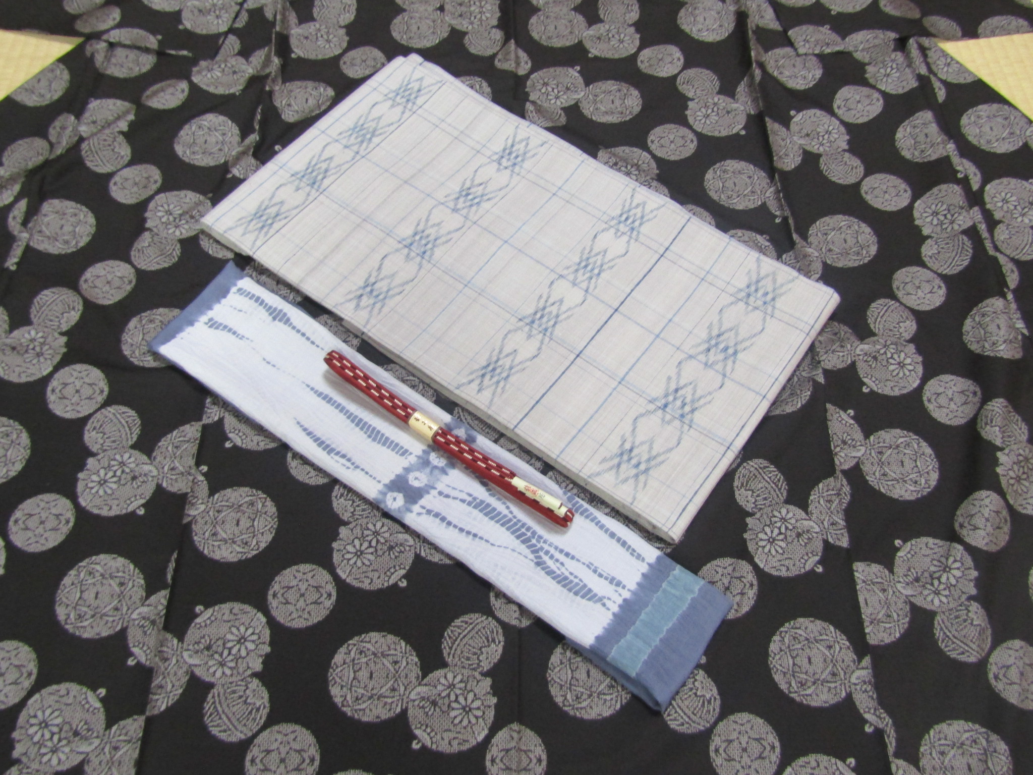 お太鼓の形を作ると、横並びのフタイビーマ絣が、縦横の細いスジで囲んだ格子の中に入り、より規則性の高い、面白い幾何学図案を構成している。無地場が多いので、ユウナの淡いグレー色が前に出る帯姿になりそうだ。では、この明度の高い久米島紬帯を、先の玩具文・泥染大島に合わせるとどのようになるだろうか。