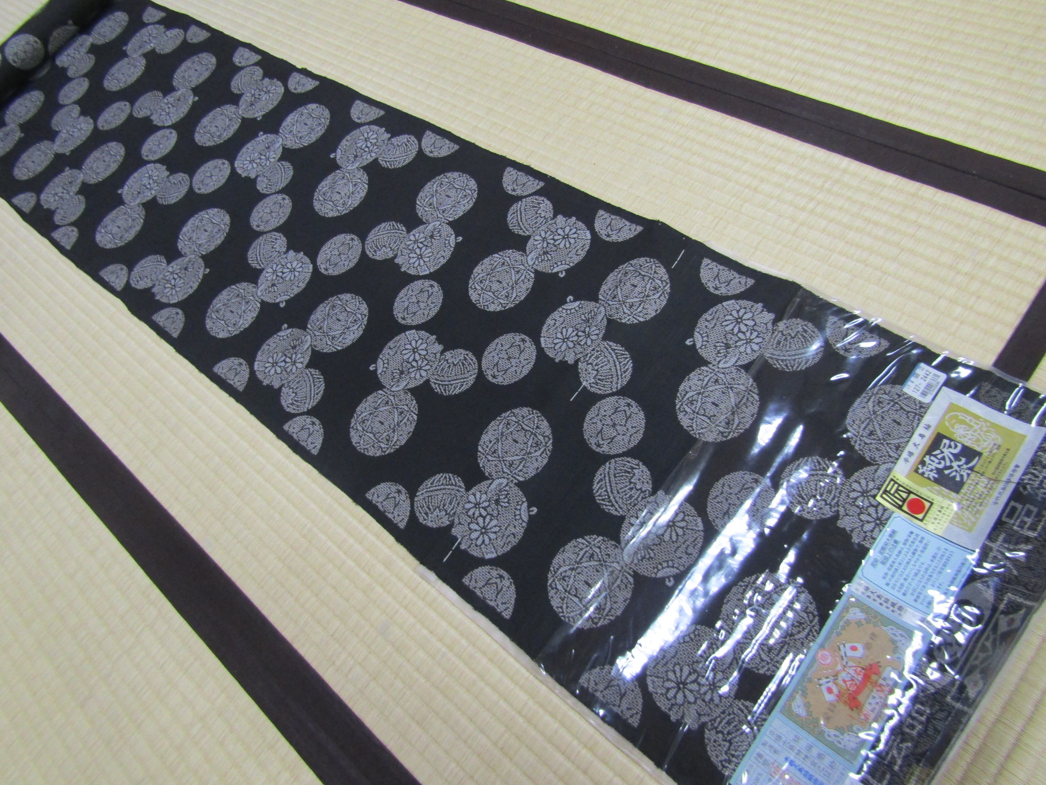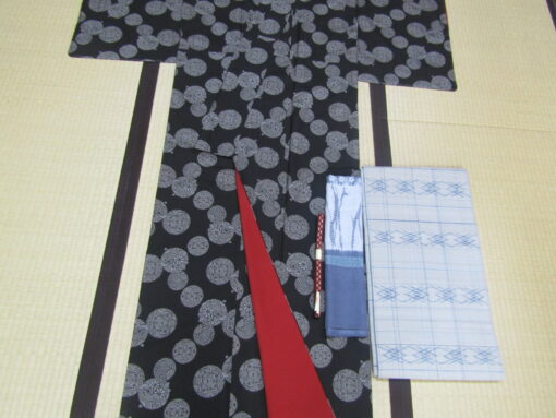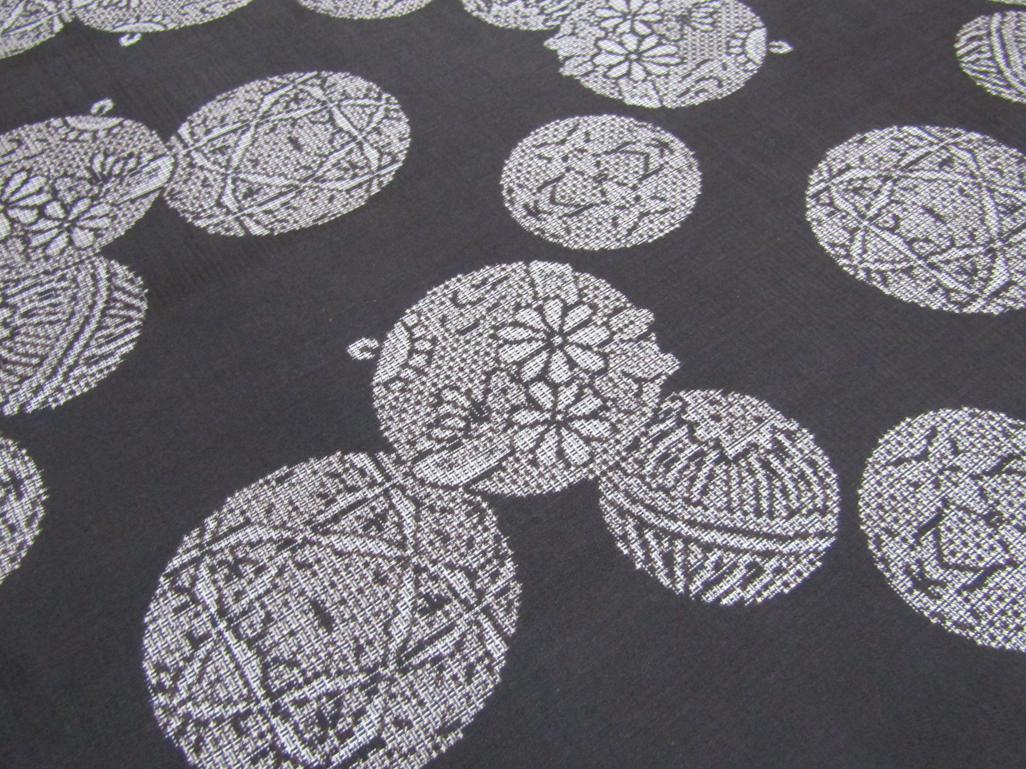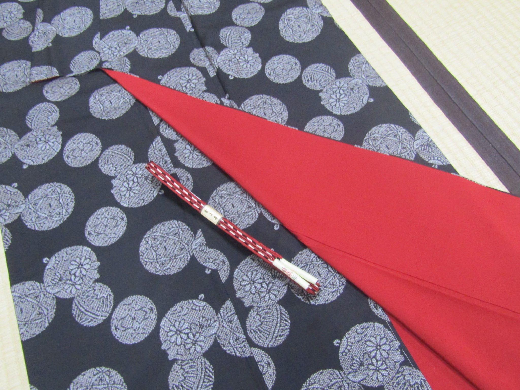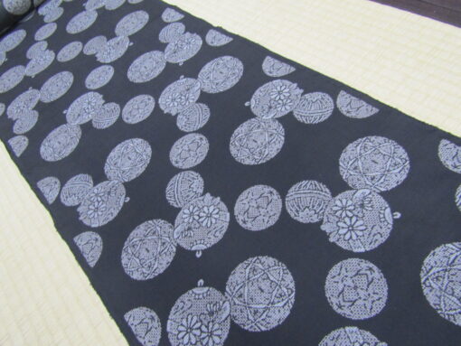 紐を通す取っ手のない丸い模様のモチーフは、手鞠。綿を芯にして糸を巻き付け、色糸で可愛い模様をかがり合わせた細工モノ・手鞠は、小さい子の遊び道具であり、またその美しさから部屋の飾りにもされている。鈴と手鞠の丸い形を散らすこの大島は、優しい雰囲気を持ち、それが泥染の渋さを和ませることにも繋がっている。