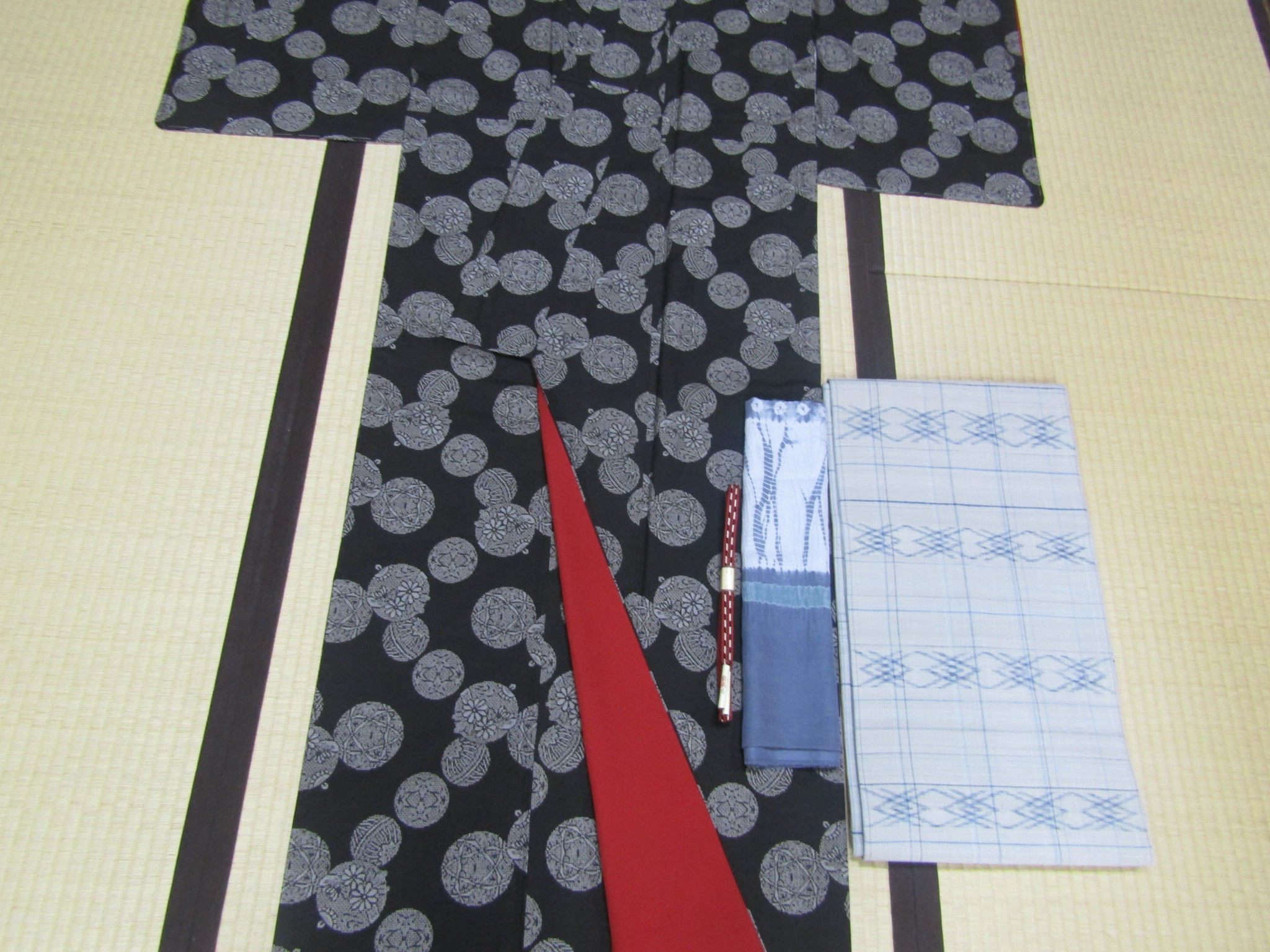 帯〆の赤みのある茶色を、八掛の色としても使っている。この色は、温かみのある秋の装いをもイメージさせる。そして渋い大島が、裾と袖口から僅かに覗く赤により、少しだけ印象が変わる。帯〆や八掛のような脇役でも、十分に装いのポイントとなり得る。それこそが、バリエーション豊かに楽しめるオシャレ着の真骨頂ではないだろうか。 最後に、今日ご紹介した品物を、誂え終えた姿で、もう一度ご覧頂くことにしよう。