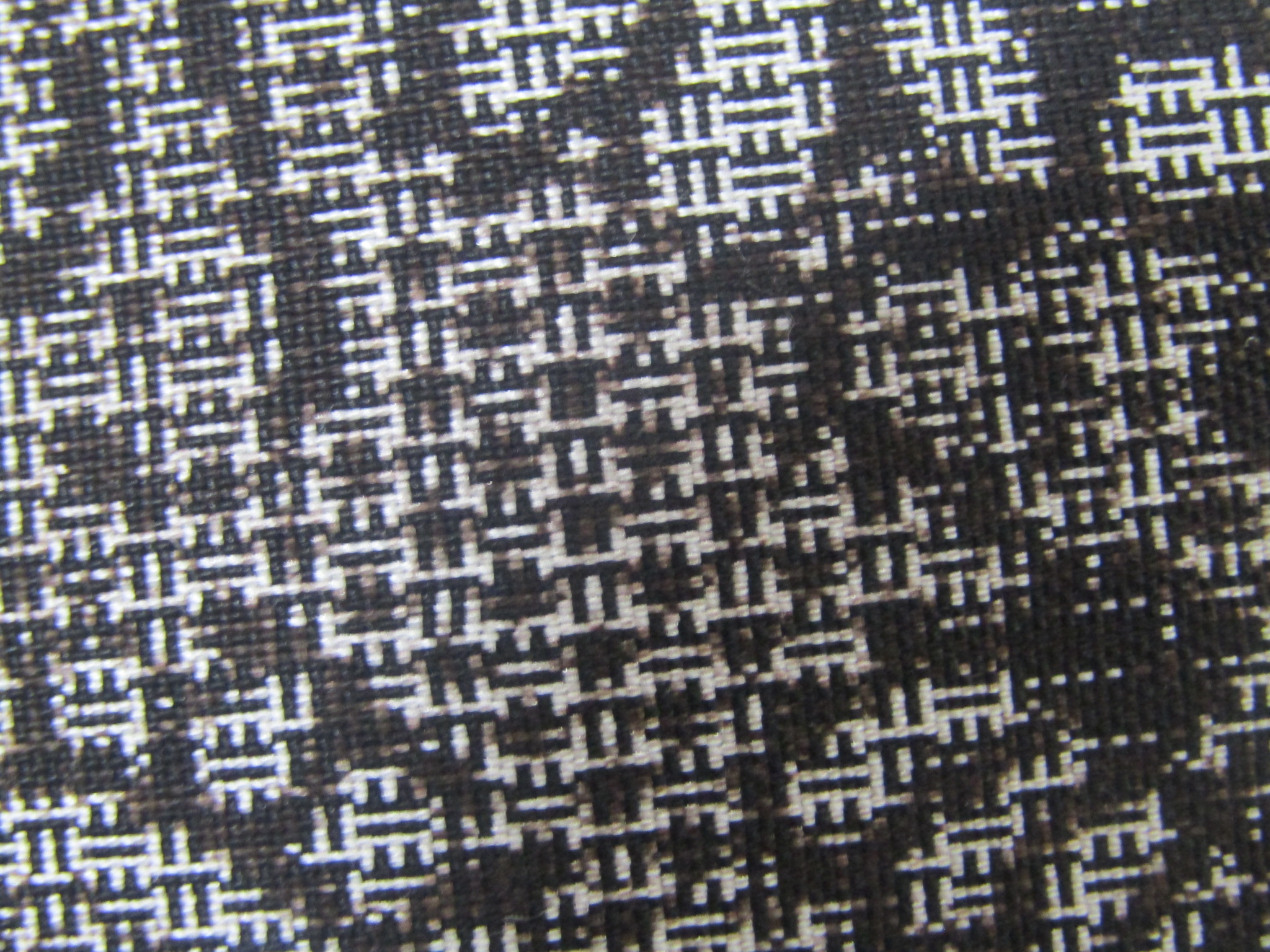 絣を拡大してみると、割込み式の構造がよく判る。この方式は、経絣糸二本と緯絣糸二本・経地糸二本と緯地糸二本・経絣糸二本と緯絣糸一本・経地糸一本と緯地糸一本の四つの工程を繰り返して織りなすもので、それはいわば、一元式と方数式の配列を交互に繰り返すものと言える。そのため絣に、アルファベットのIやEに似た模様が現れる。