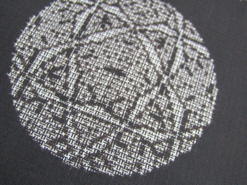 割込み絣は、絣糸を作る絣締めの際に、また製織の時の絣合わせの際にも、異なる数の絣糸を組合わせているだけに難しく、職人には高度な技術が求められる。しかし、そうして生まれた複雑な絣模様は、他の方式では見られない立体感が垣間見える。この鈴と手鞠の図案にも十分にそれが表れており、鞠柄の特徴である糸かがりの模様姿が、精緻な絣によって映し出されている。