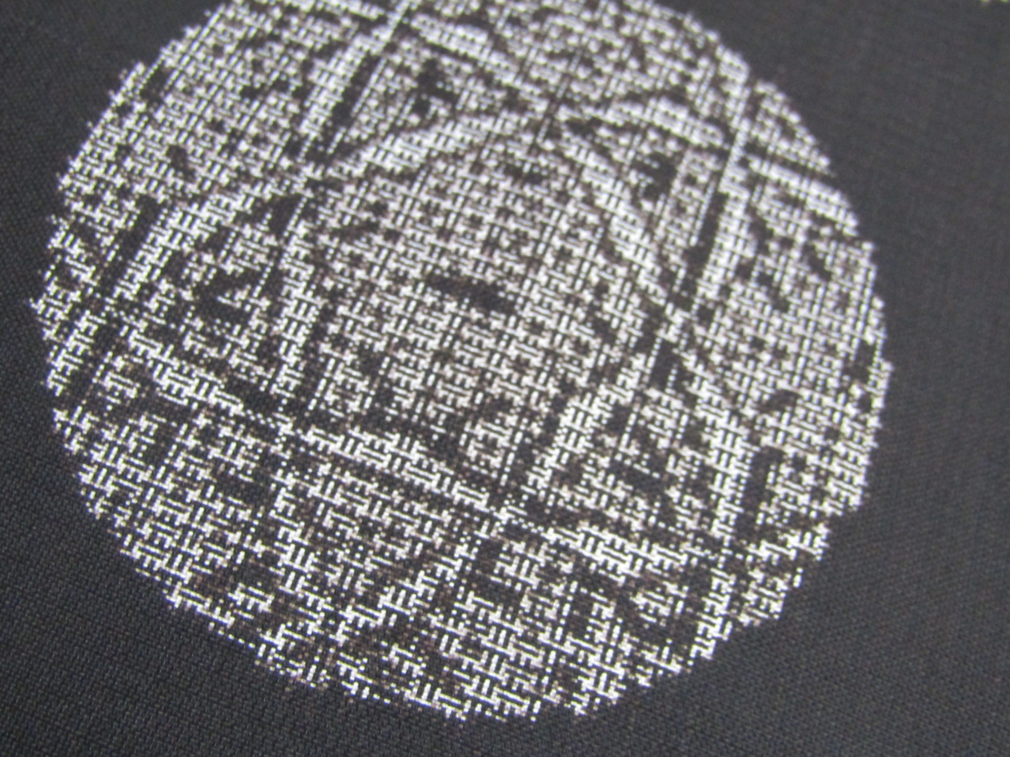 さて、この大島の手鞠模様で表現されている絣模様を見てみると、風車型の一元でもなく、T字型の方数でもない複雑な形の絣で構成されている。実はこの絣は、一元式と方数式を交互に使って織り込まれたもので、これを「割込み式」と呼んでいる。そのため絣の形も、風車とTの字を混ぜ合わせたような、見慣れないものになっているのだ。