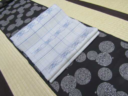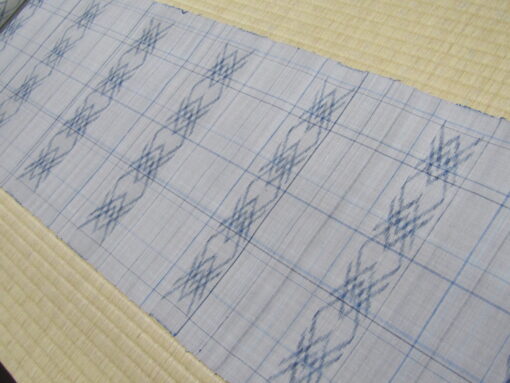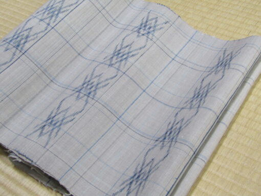 久米島紬の多くは着尺で、帯の製織は多くない。しかも染料がユウナである点を考えると、この帯はかなり珍しい品物の部類に入る。地をユウナで染、絣には藍。淡い鼠とすっきりした青の組み合わせは、爽やかで明るい印象をもたらしている。