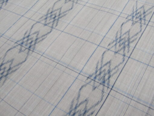 模様は、菱文を二重に重ねた幾何学的な不思議な図案。この絣模様は、久米島紬によくあしらわれている図案で、「フタイ(二重)ビーマ(結び)」と名前が付いている。そして横に繋いだ菱重ねの中には、松皮菱のような形も見えている。この図案を花に見立れば、「ファナ(花)ビーマ」という別の模様になる。