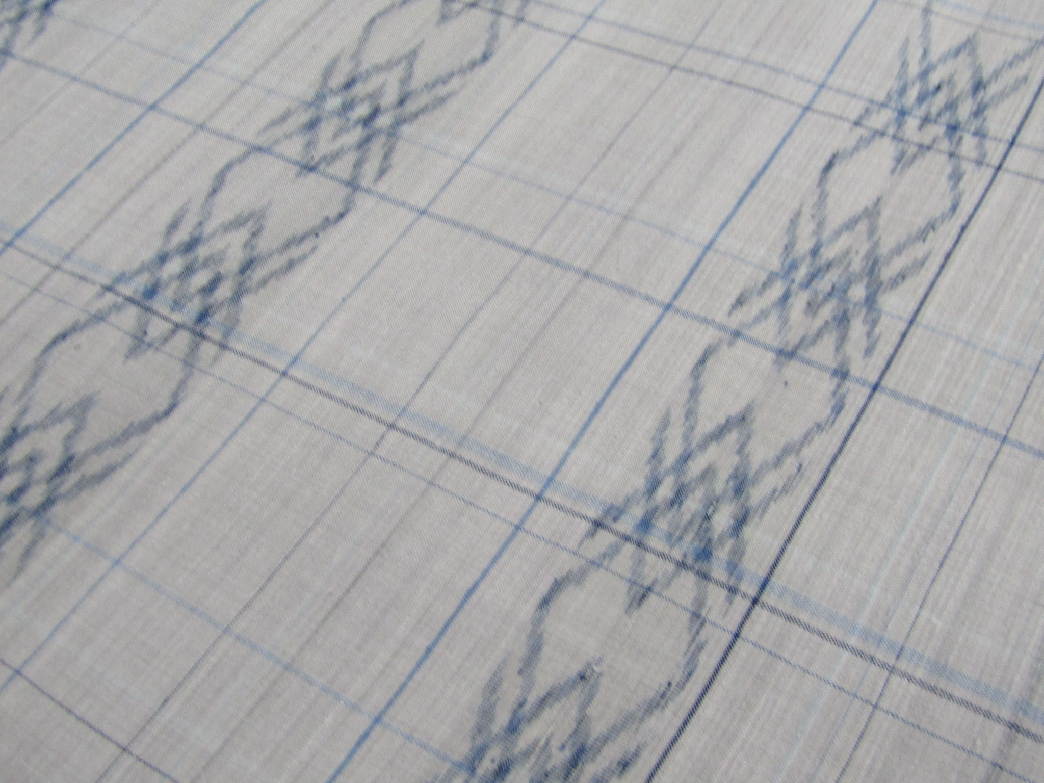 この大島は図案の可愛さもさることながら、模様の根幹を成す絣の構成の複雑さに、大きな特徴がある。そもそも絣は、経緯の絣糸を一本一本正確に合わせて模様を作り上げる。この糸と糸の交点が絣となる訳で、それこそが模様の根幹であり、意匠を表現する基点でもある。