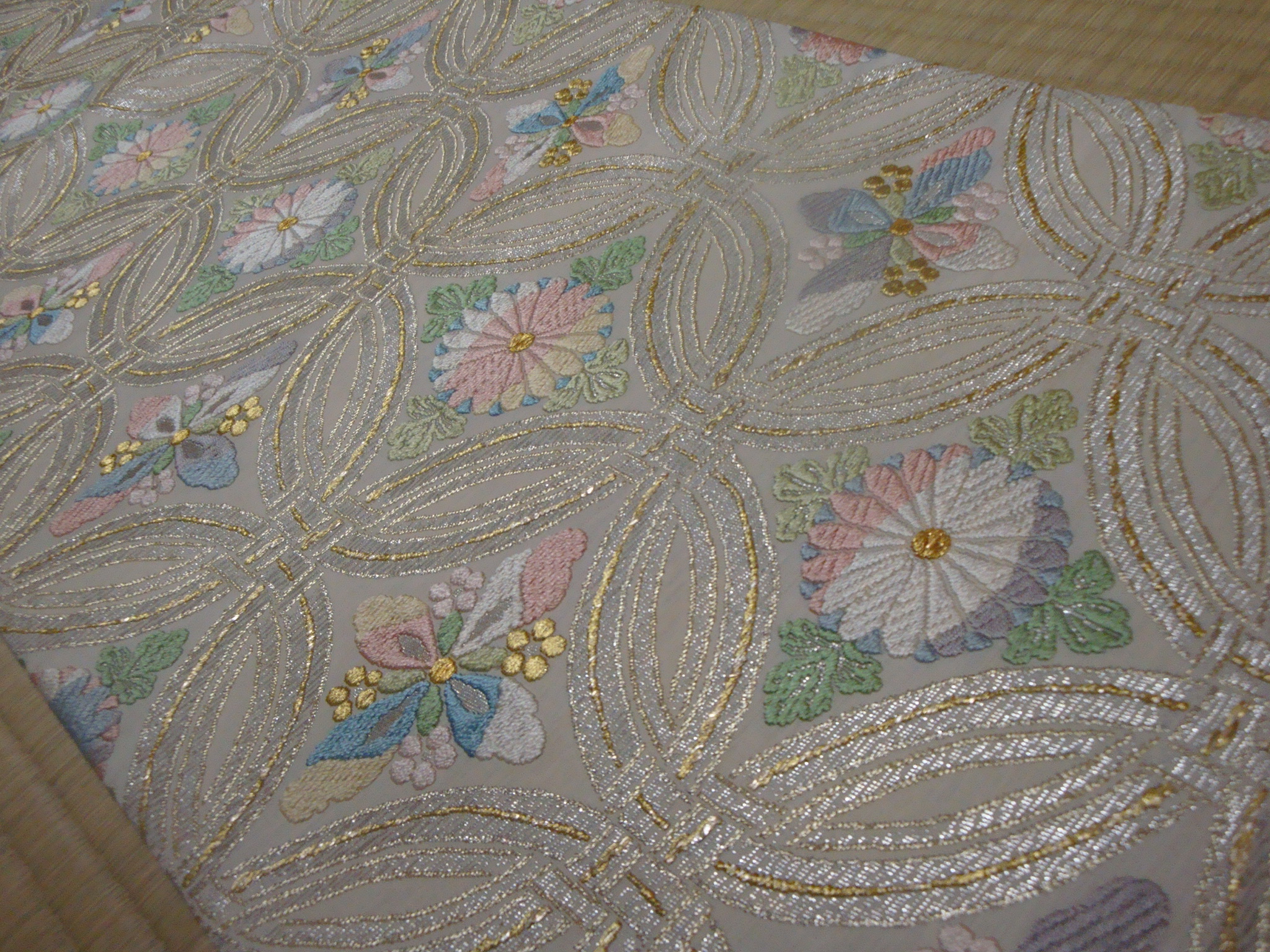 (銀地 七宝花菱文様 唐織手機袋帯・おび弘 西陣番号607)