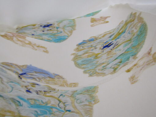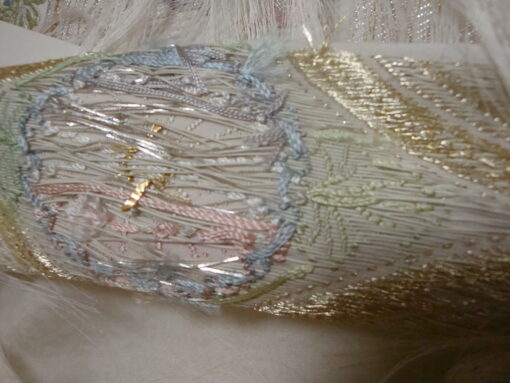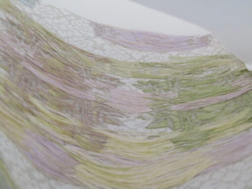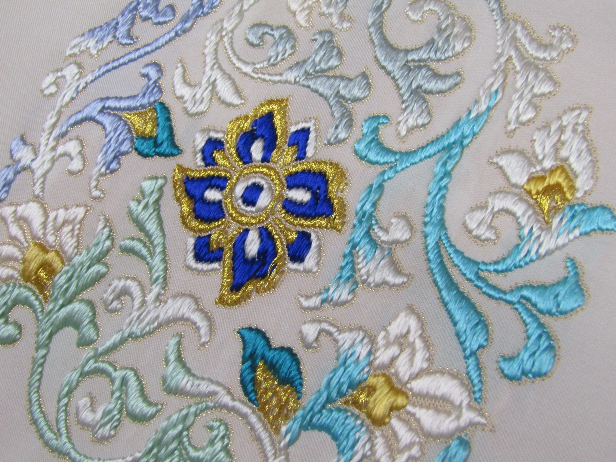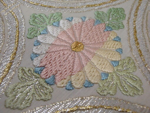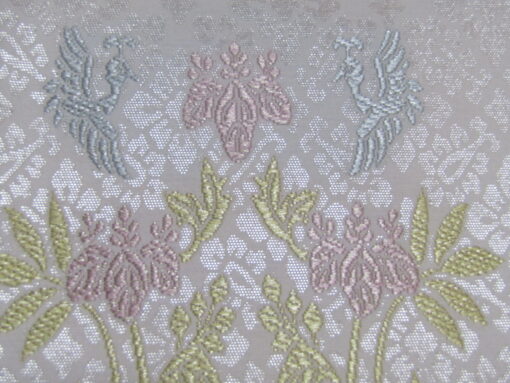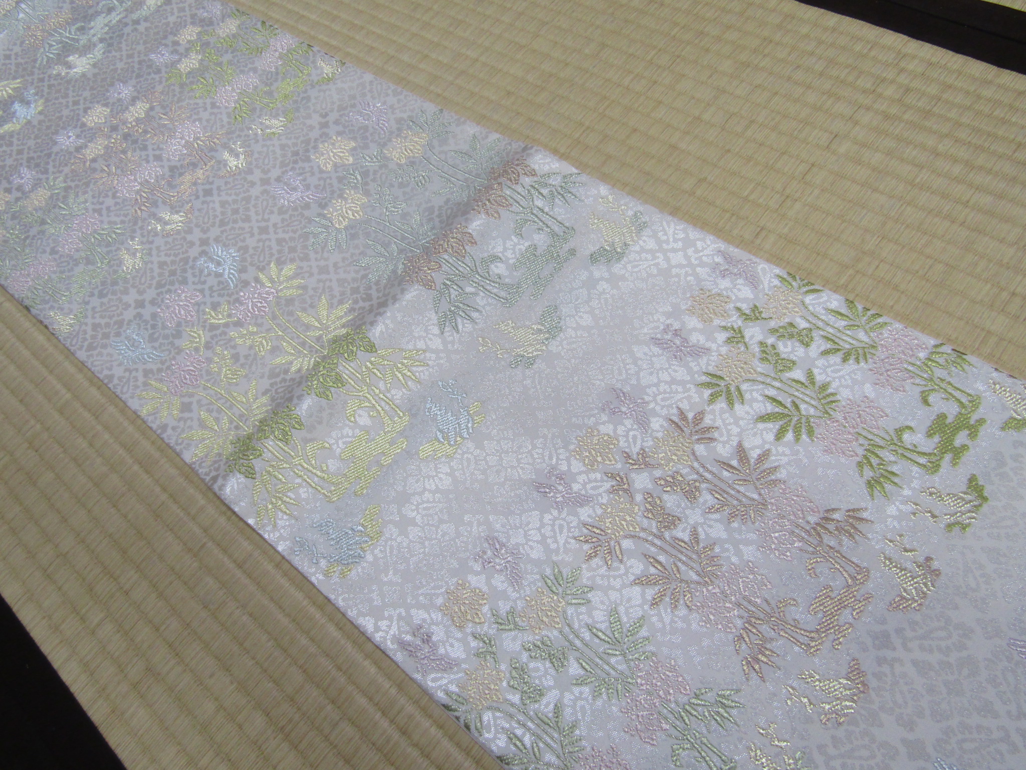 最後に、参考までに機械で織った唐織帯をご紹介しておこう。文様は天皇の御袍にあしらわれている高貴な桐竹鳳凰文。白い地の上に、淡いパステル色の浮柄が表れている。なお製織した山口美術織物は、紫紘の創業者・山口伊太郎氏の弟、山口安次郎氏が創業した山口織物(西陣番号79)とは別の織屋。安次郎氏の山口織物は、主に能衣装を製織していた高級唐織メーカーだったが、現在は機を止めてしまっている。