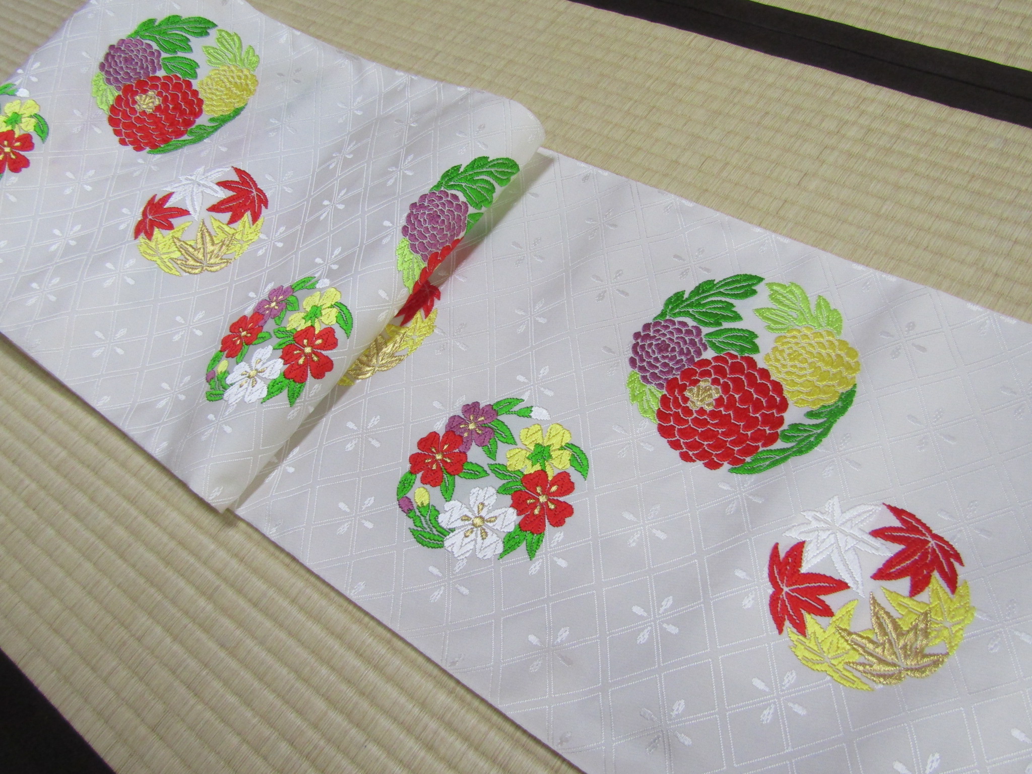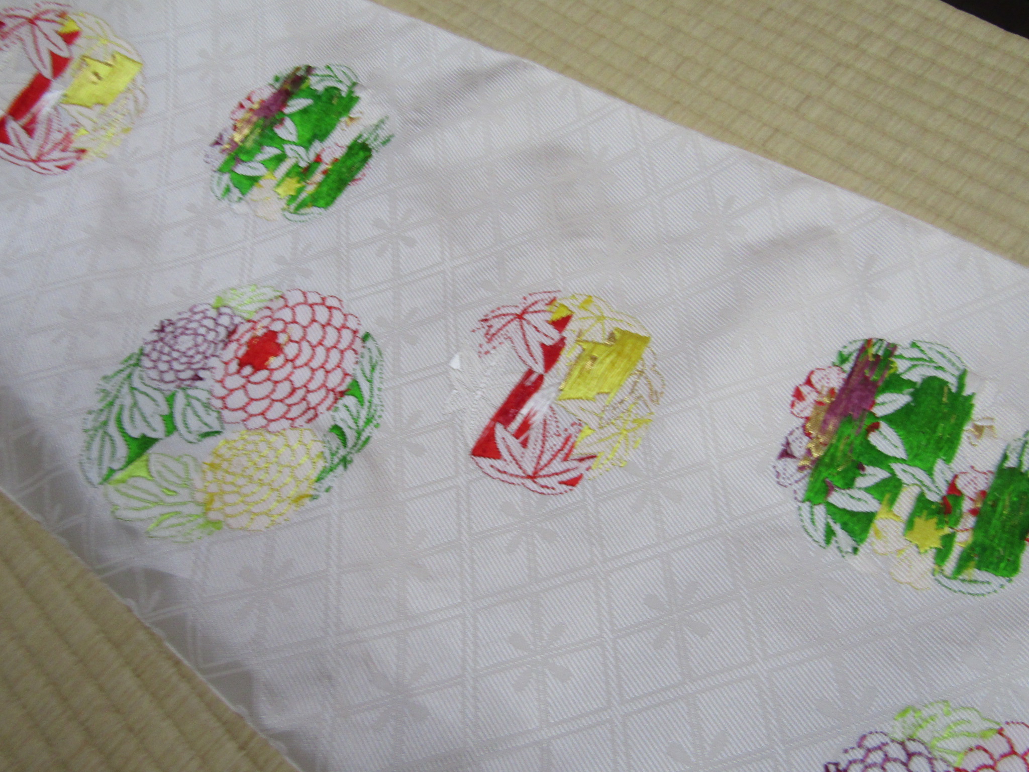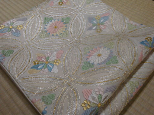 (白地 四季花の丸文様 唐織手機丈二帯・奥田織物 西陣番号359)