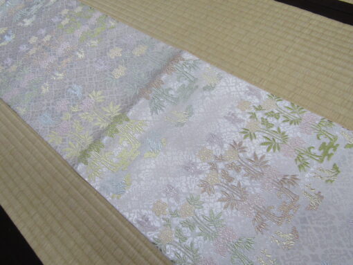 さてまた前置きが長くなったが、帯の幅は、江戸・寛政年間から徐々に広くなり、それに伴って帯生地の種類も加飾方法も多様化した。これが明治になり洋装化が進んだこともあって、帯質にも少しずつ変化が生まれる。しかしそこには、前述した家庭画報の記事にもあるように、流行に偏らない帯が存在していた。