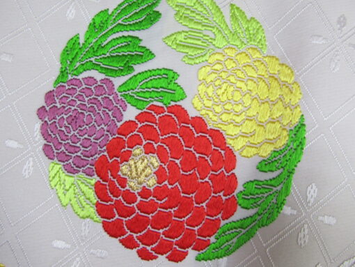 菊の丸、桜の丸、楓の丸と日本の季節を彩る代表的な花を、円形に図案化した「四季花の丸」は配色も鮮やか。ふっくらと織り上がった唐織の模様姿で、女の子の装い姿はより愛らしさが増す。そしてボリュームのある花の姿は、着姿に華やかさをもたらす。