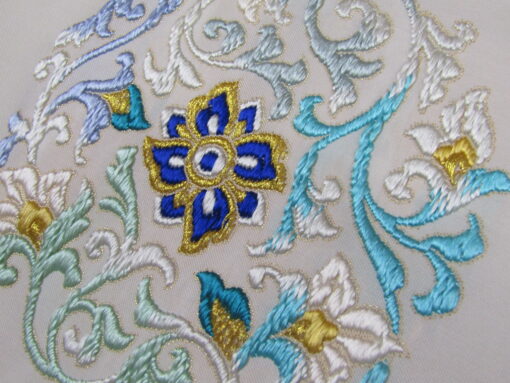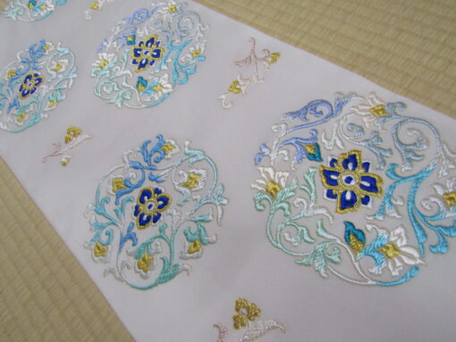 最初の有職七宝文は、ややフォーマル感の強い姿で織り上がっているが、この唐花唐草の丸文は、いかにも正倉院的図案で、堅苦しさを消した動きのある図案になっている。配色はほぼ青系だけを使い、同系色の濃淡で模様にアクセントを付ける。模様の立体感と巧みな色使いにより、華やかさと爽やかさを併せ持つ帯姿に仕上がっている。