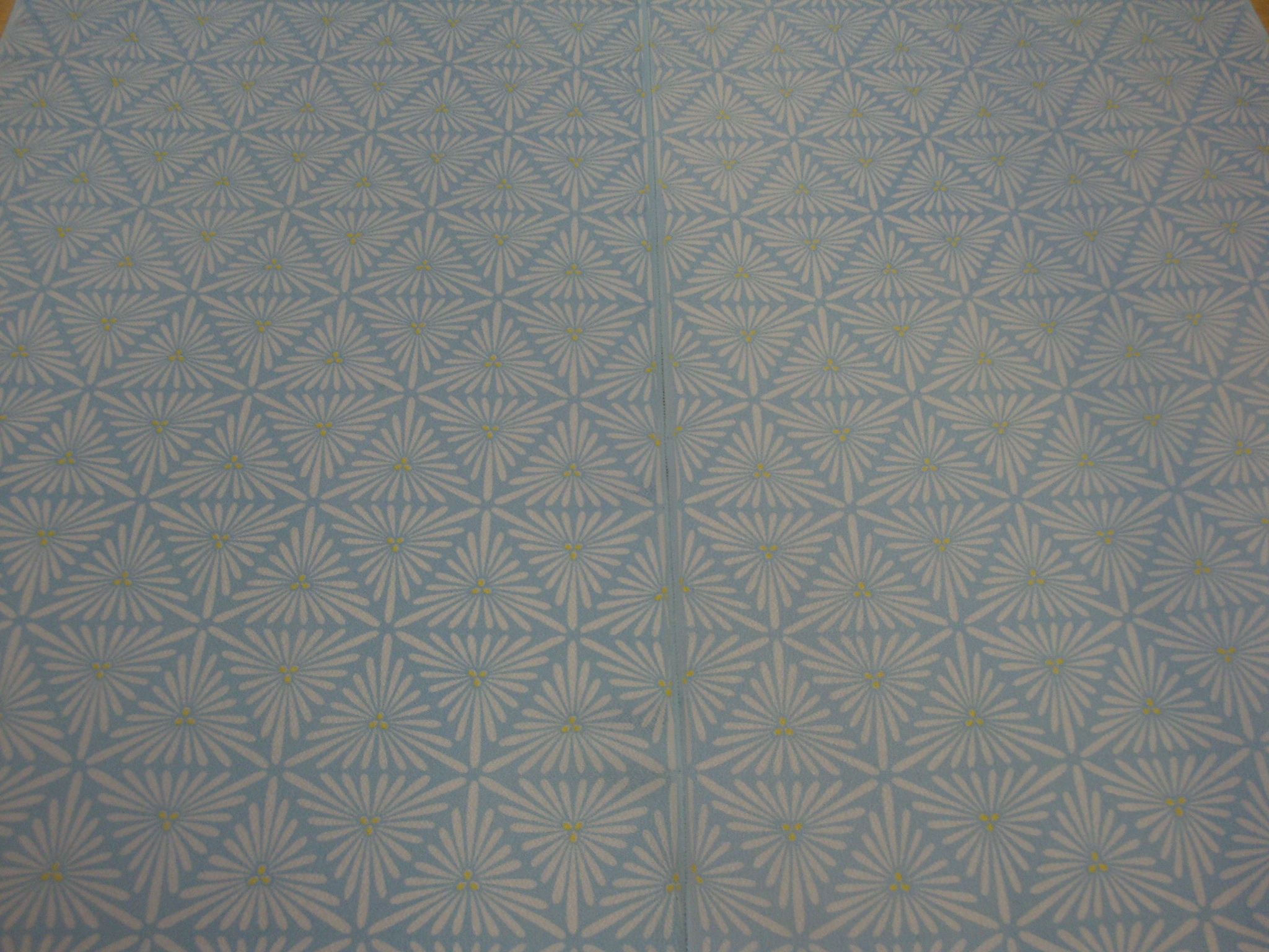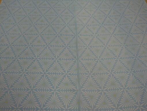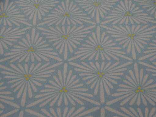 こちらも菱文を分割した三角を交互に繋ぎ、鱗文とした意匠。ただ先ほどの龍村帯とは違い、図案が同じ菊菱で統一されていることから、鱗文と判りやすい。三角の放射状に菊花弁を描くデザインが何ともオシャレ。松寿苑が創る小紋には、このように古典図案をモダンな姿に変身させるものが多い。地の空色と菊の中心に挿してある黄色が、優しい着姿を演出する。この小紋には、魔除けの鱗柄という印象がほとんど感じられない。