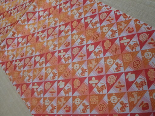 こうして図案を眺めていると、鱗文と四菱文が輻輳して、なかなか視点が定まらない。そして三角文の中に様々な図案が入ったことで、複雑化に一層輪をかけている。さらに配色が、橙色の濃淡と白だけというのも、この個性的な意匠をより増幅させている。経錦は、経糸で地と文様を織り出した紋織物だが、この龍村の光波帯は滑るような地の風合いを持ち、しなやかで大変締めやすい。以前と比べれば少し高くなったが、それでもリーズナブルに、龍村が考案する独特の文様を楽しめる品物かと思う。