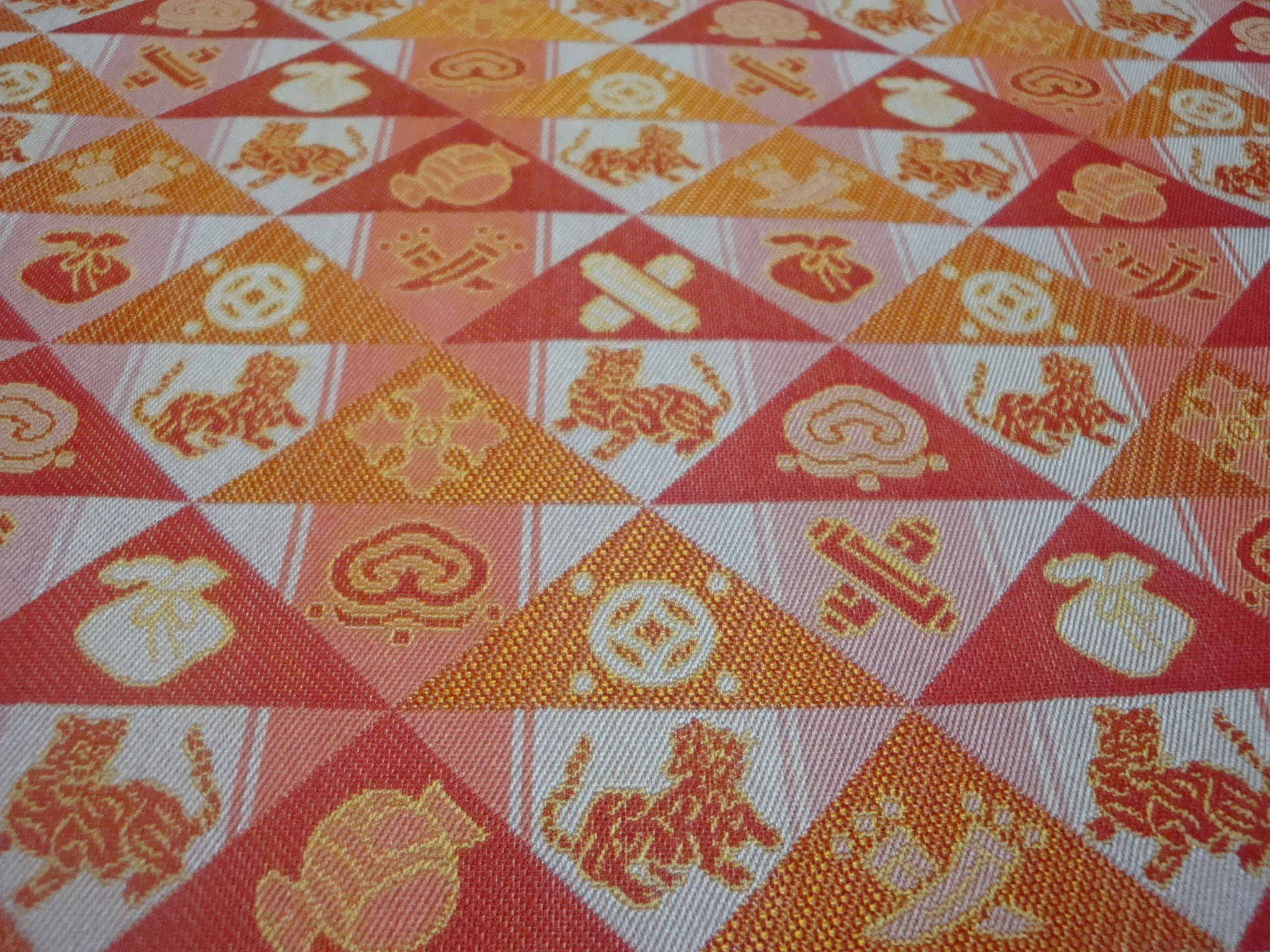 龍村の個性が光る京袋帯・光波帯シリーズの中にも、鱗を使った意匠がある。この図案は、菱を半分に割った三角の中に、宝尽し文を構成する打出の小槌や丁子や分銅等と、虎の姿を交互に入れ込んだもの。虎(寅)は中国・明王朝の時代に、子孫の長寿と健康を願って、盛んに裂地のモチーフとして使われていた。魔除けの鱗文と縁起物の宝尽し文、さらに虎が共演することで、吉祥極まる帯姿になっている。