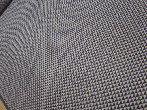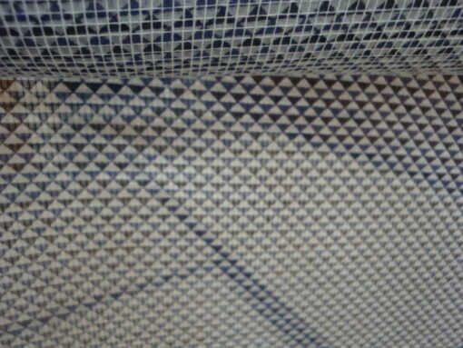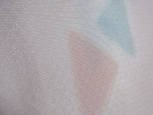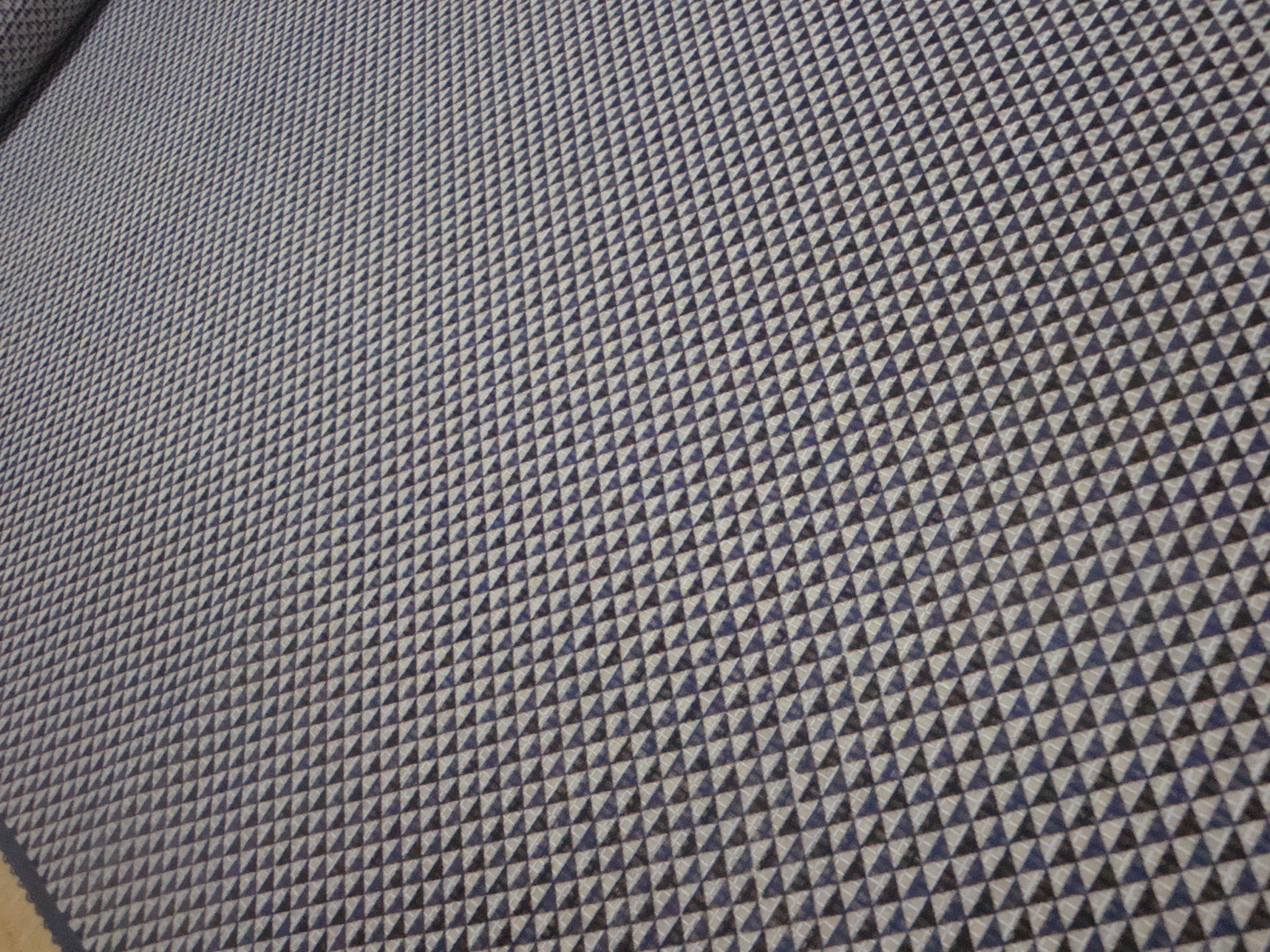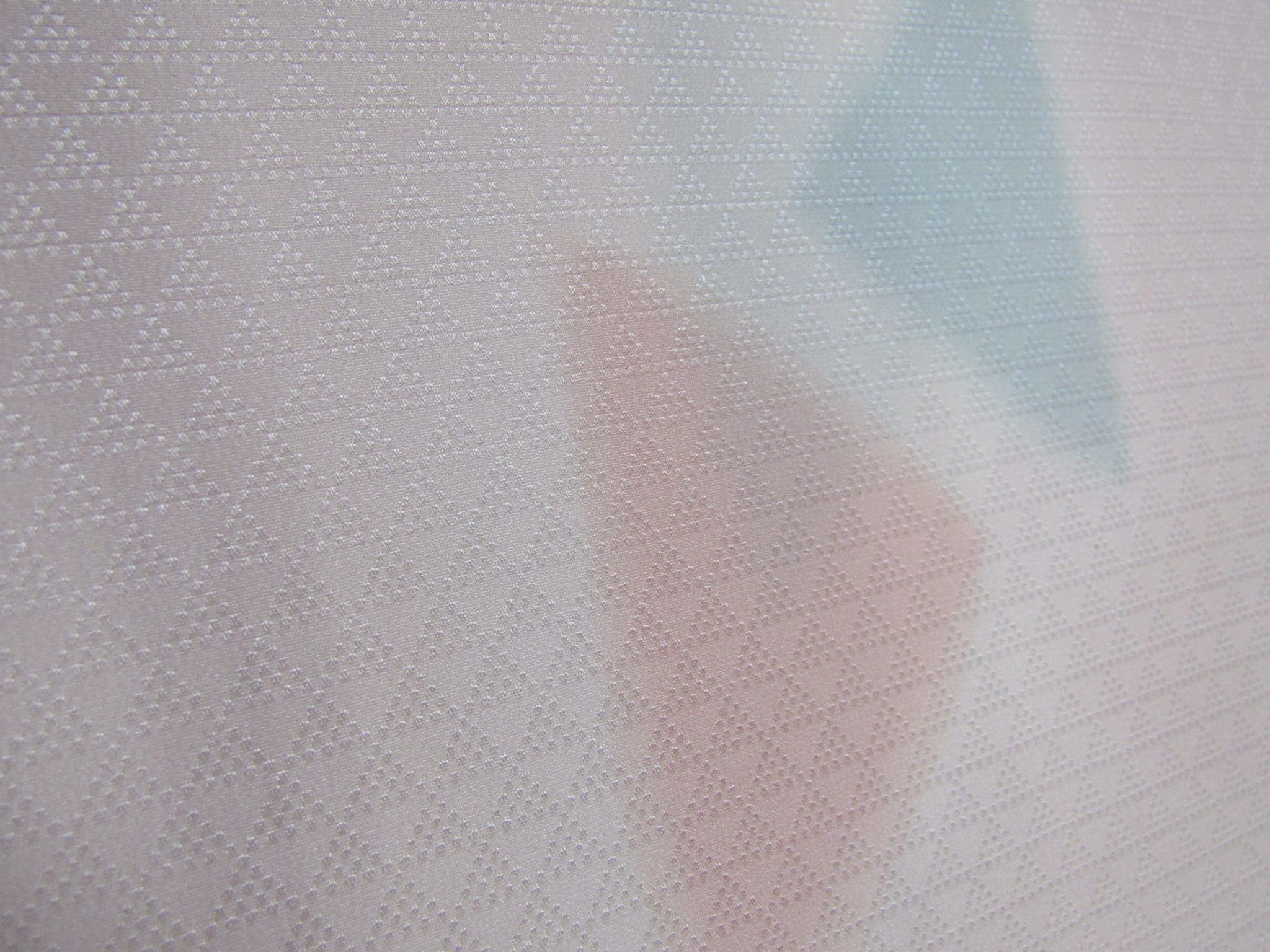 こうして、反幅いっぱいに細かい三角形が規則的に並ぶ姿を見ると、まさに蛇か魚の鱗そのものに見えてくる。これは反物を平面に置いて写しているが、図案がまるで鱗の様に浮き上がり、立体的に見えている。ここまでリアルに鱗を感じさせる品物も珍しい。