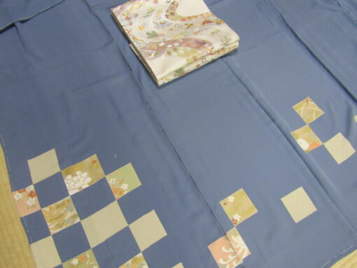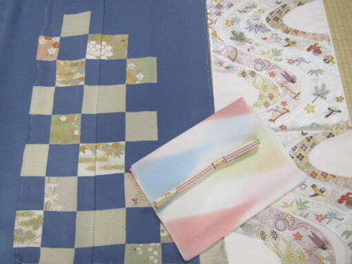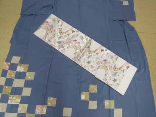 (縹色地 市松取四季花模様・訪問着  白地 流水に宝尽し文様・袋帯)
