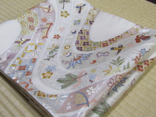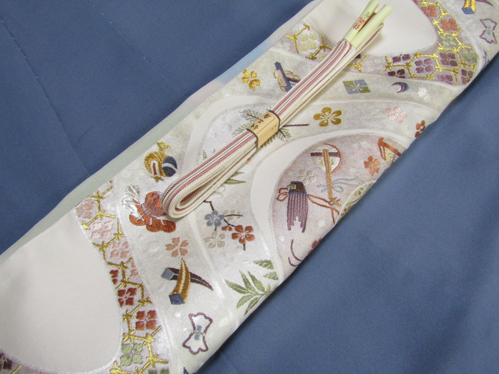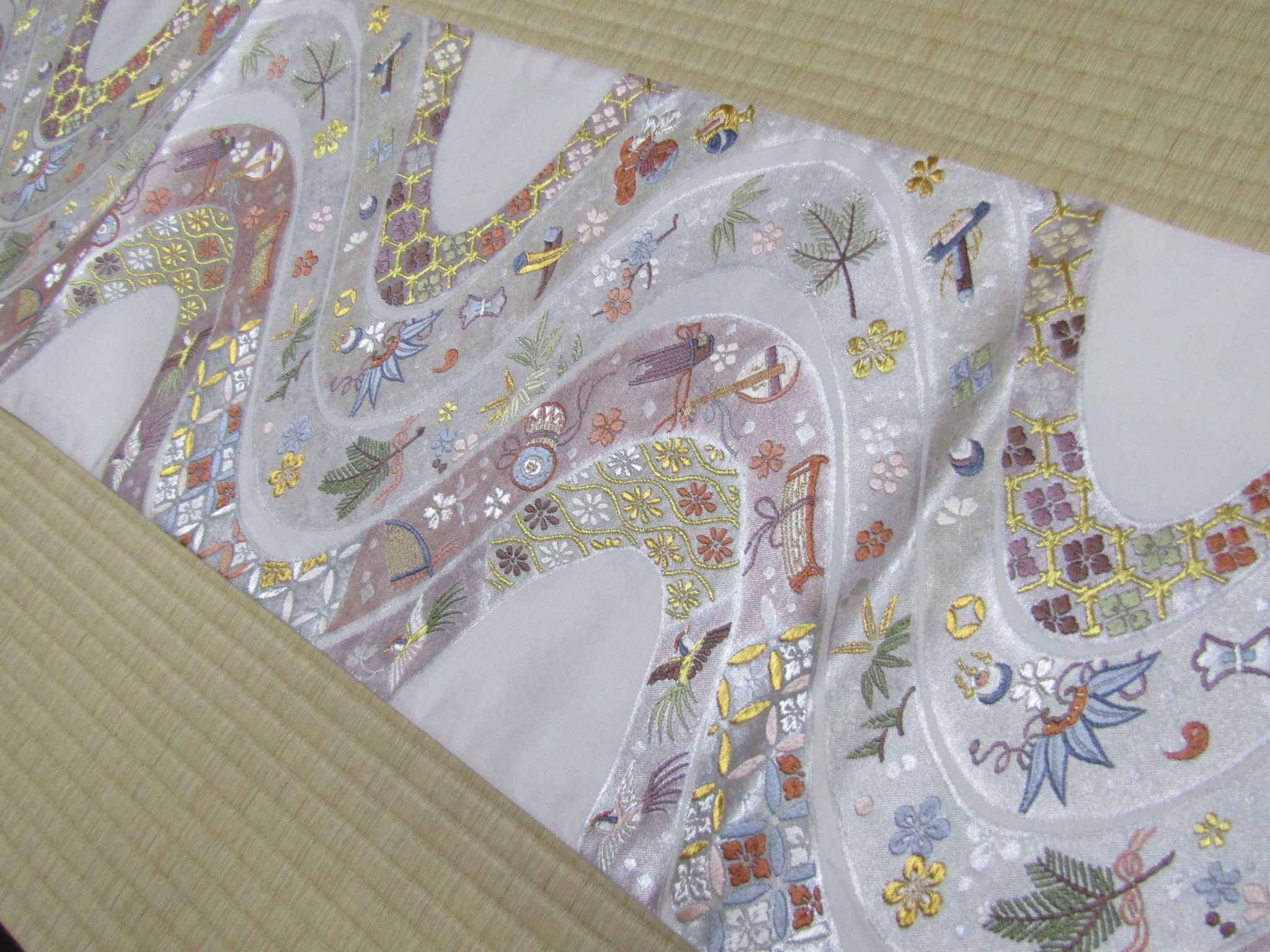 (白地 流水に小袖宝尽し文様 袋帯・紫紘)