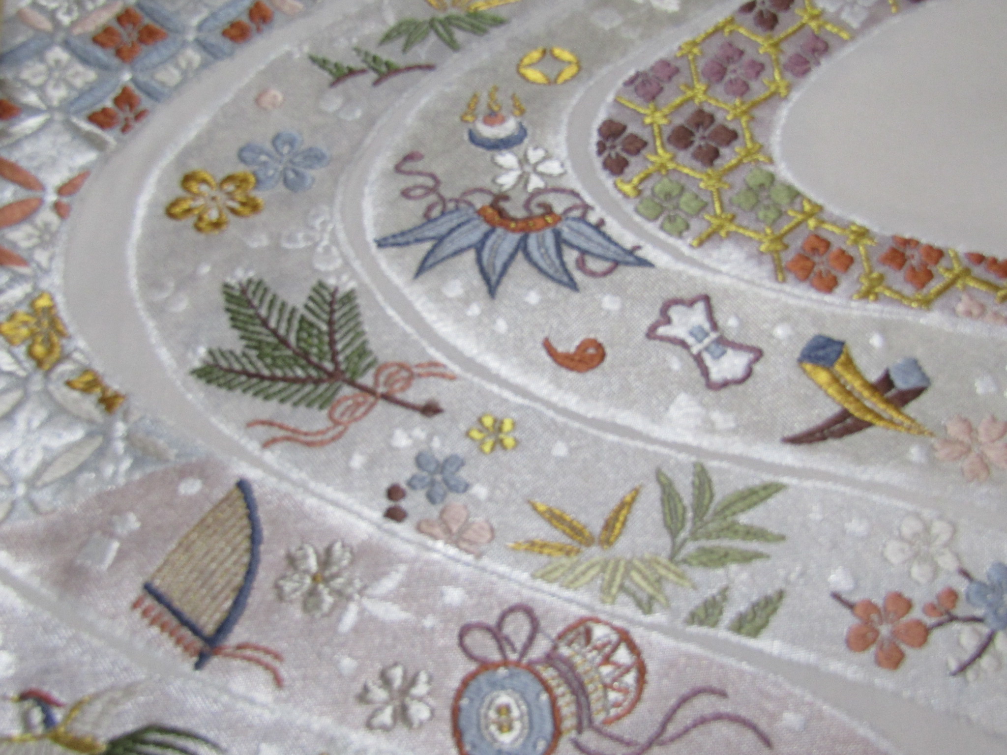 少し話が逸れたが、江戸時代初期の小袖意匠は、生地全体に模様が行き渡るような、いわゆる「総模様」の華麗な姿が目立ったが、中期以降は、帯幅が広がったことに伴って、模様を腰や裾の部分に限定して置くようになる。そして裾からの模様位置の高さにより、それぞれを八寸・五寸・三寸模様と呼び、模様が低い位置にあるものは年配向、逆に高い位置にあるものを若向とするようになった。これが江戸期を発祥とする「裾模様」の定義である。