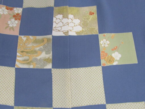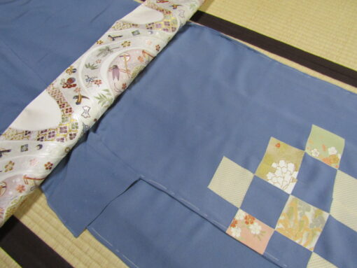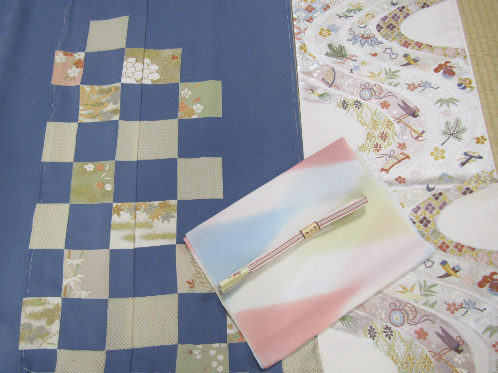 しかし前を合わせてみると、意外に市松模様が着姿の前に出ている。もしかしたら、「付下げ的なキモノ」ではなく、訪問着本来の姿かも知れない。仮絵羽の場合には、こうして前姿を簡単に合わせることが出来るので、着姿が想像しやすい。これが反物になっている付下げだと、柄位置を合わせなければならず、少し厄介な作業になる。それでは、この個性的な市松取訪問着にどのような帯が相応しいのか、フォーマル度を高めることを意識しながら、帯選びをしてみよう。