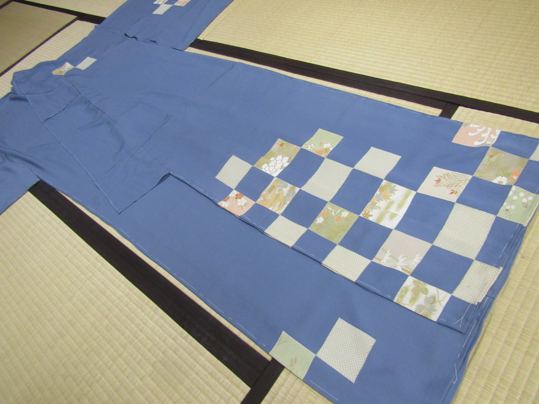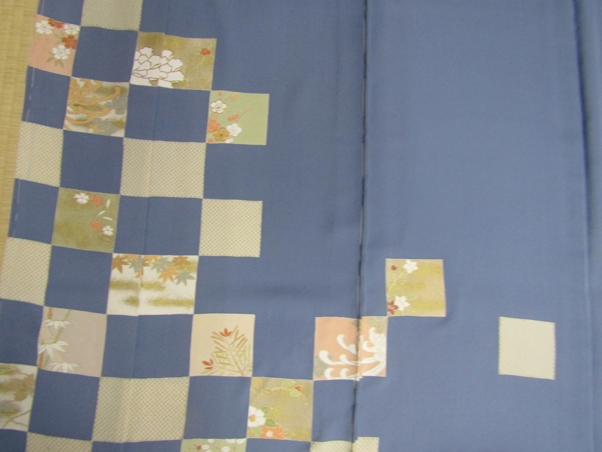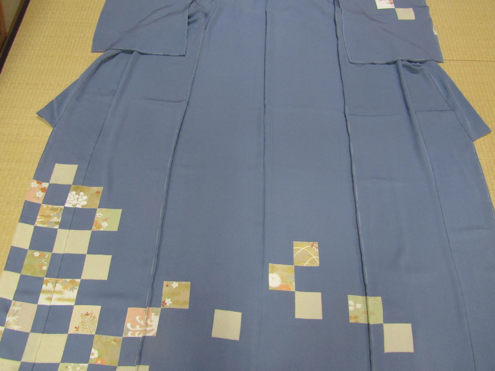 (一越 縹色地 市松取四季花模様 型友禅訪問着・トキワ商事)