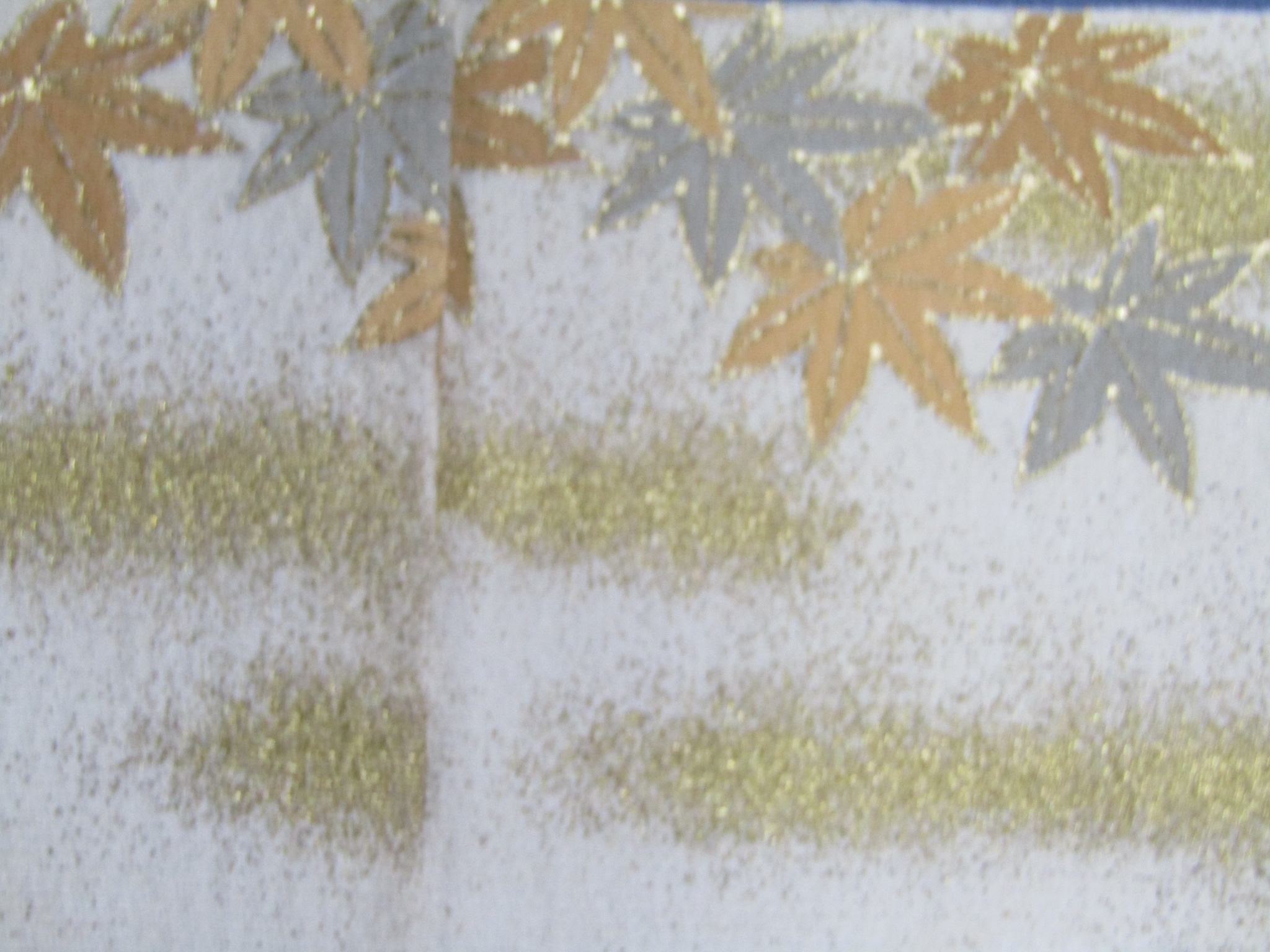 模様中心の上前身頃でも、一番目立つところに置かれた楓図案。白い地から、金加工で表現された楓葉と雲が浮き立っている。