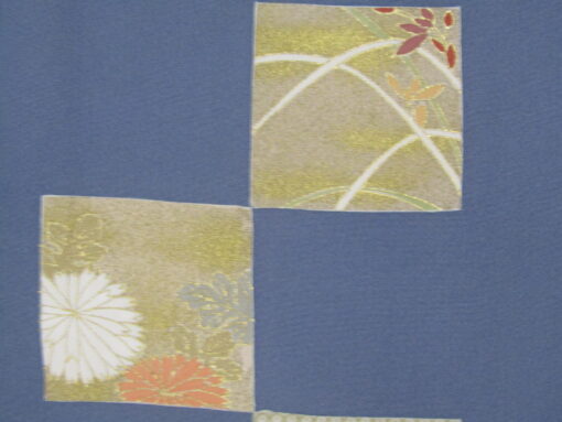 四角い格子の中には、梅や牡丹、桜に菊など春秋の花々が描かれている。その描き方も、大きさや花姿の切り取り方を変えており、また画像で判るように、一部の四角は染疋田の施しがなされている。一見単純に見える何気ない意匠でも、細部を見れば行き届いた工夫の跡が見られる。