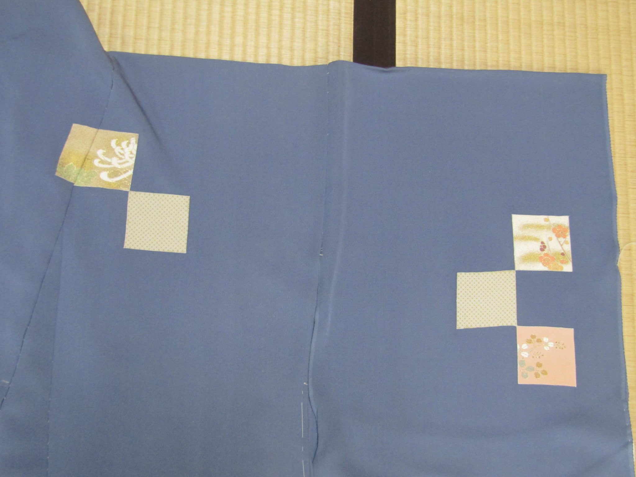 付下げと訪問着の違いは何かと問われた時、まずは先述したように、商品としての形状の違いが挙げられる。付下げは反物で、訪問着は絵羽付けである。かなり以前のブログ稿で、この違いについて説明しているが、この形状が模様姿の違いに直結するので、改めて少し触れてみたい。