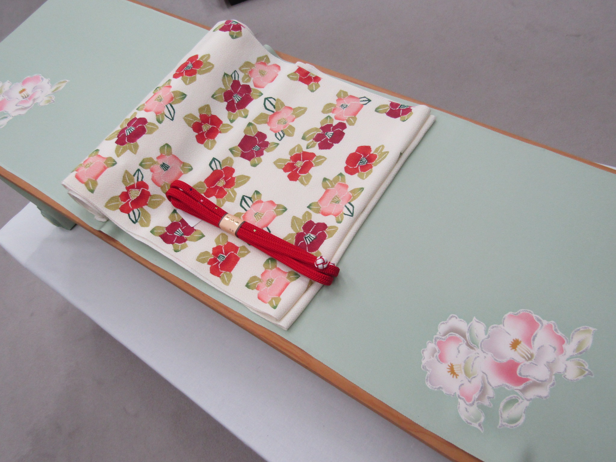 (今日の店内の飾り台は、椿 椿小紋・椿型絵染帯)