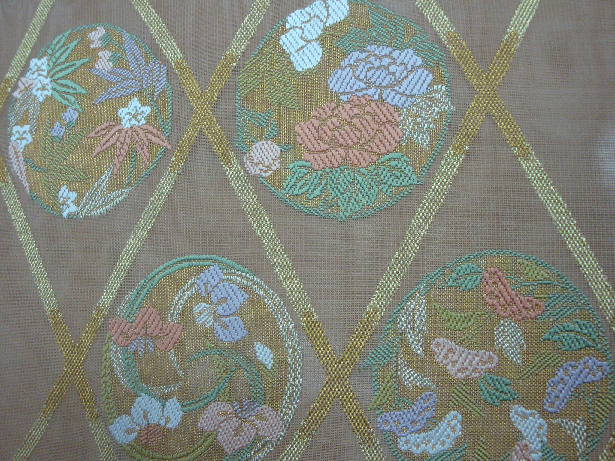お寺や神社の建物では、たまに格子状に組んだ木枠の中に図案を描いた「天井絵」を見かけることがある。この菱形格子のことを、格天井(ごうてんじょう)と言う。一つ一つの菱組の中は狭く、それほど大きな図案は入らないので、大概こうした和花の丸があしらわれる。図案的に考えれば、菱文と花の丸文との融合文様になる。立体的で見栄えの良い文様であることから、帯の意匠として使われることが多い。この紗袋帯には、夏モノらしく、女郎花の丸や杜若の丸の姿が見られる。