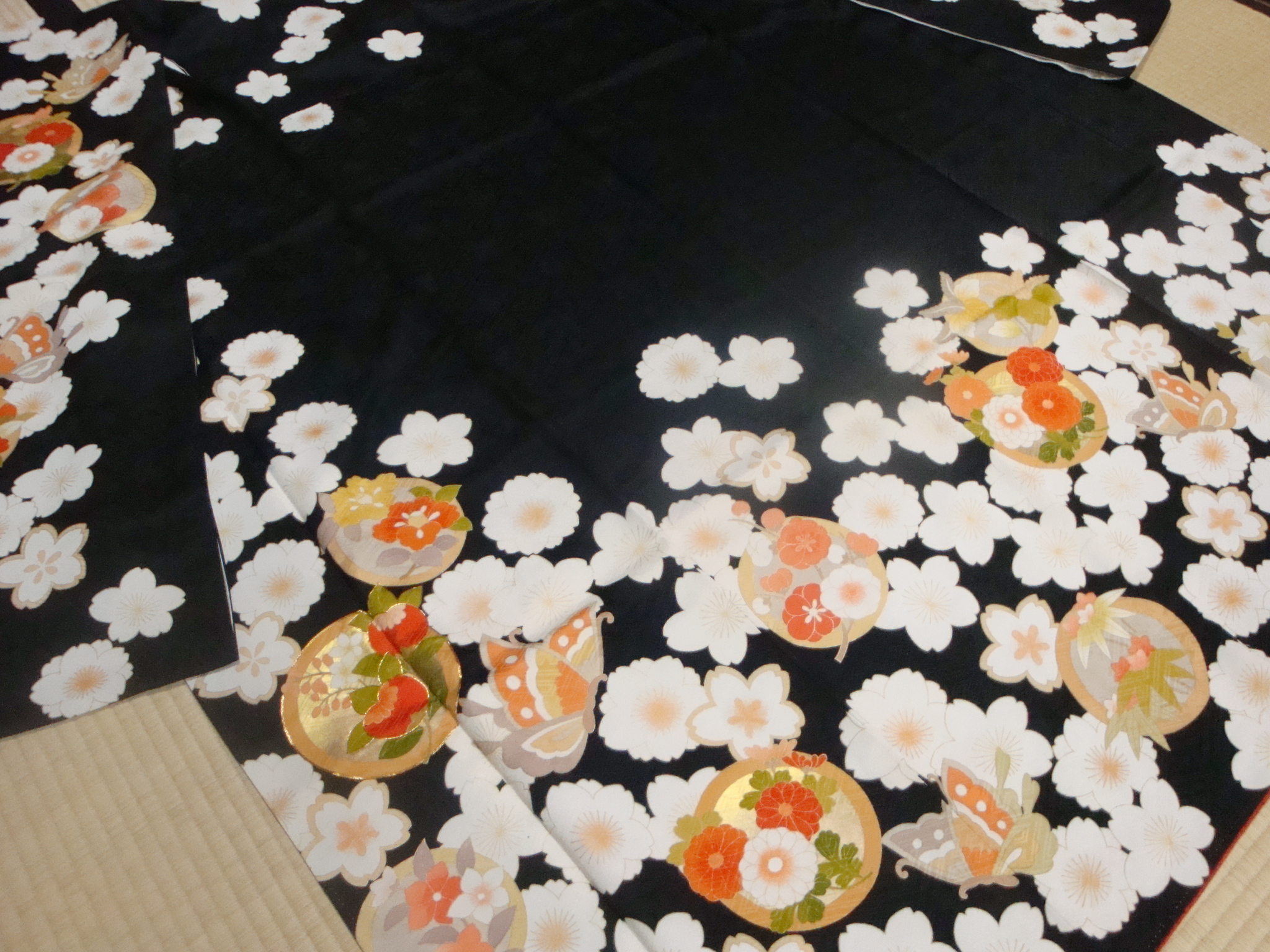 (黒地 花の丸文に菊桜尽くし模様 七歳用絵羽祝着・菱一)