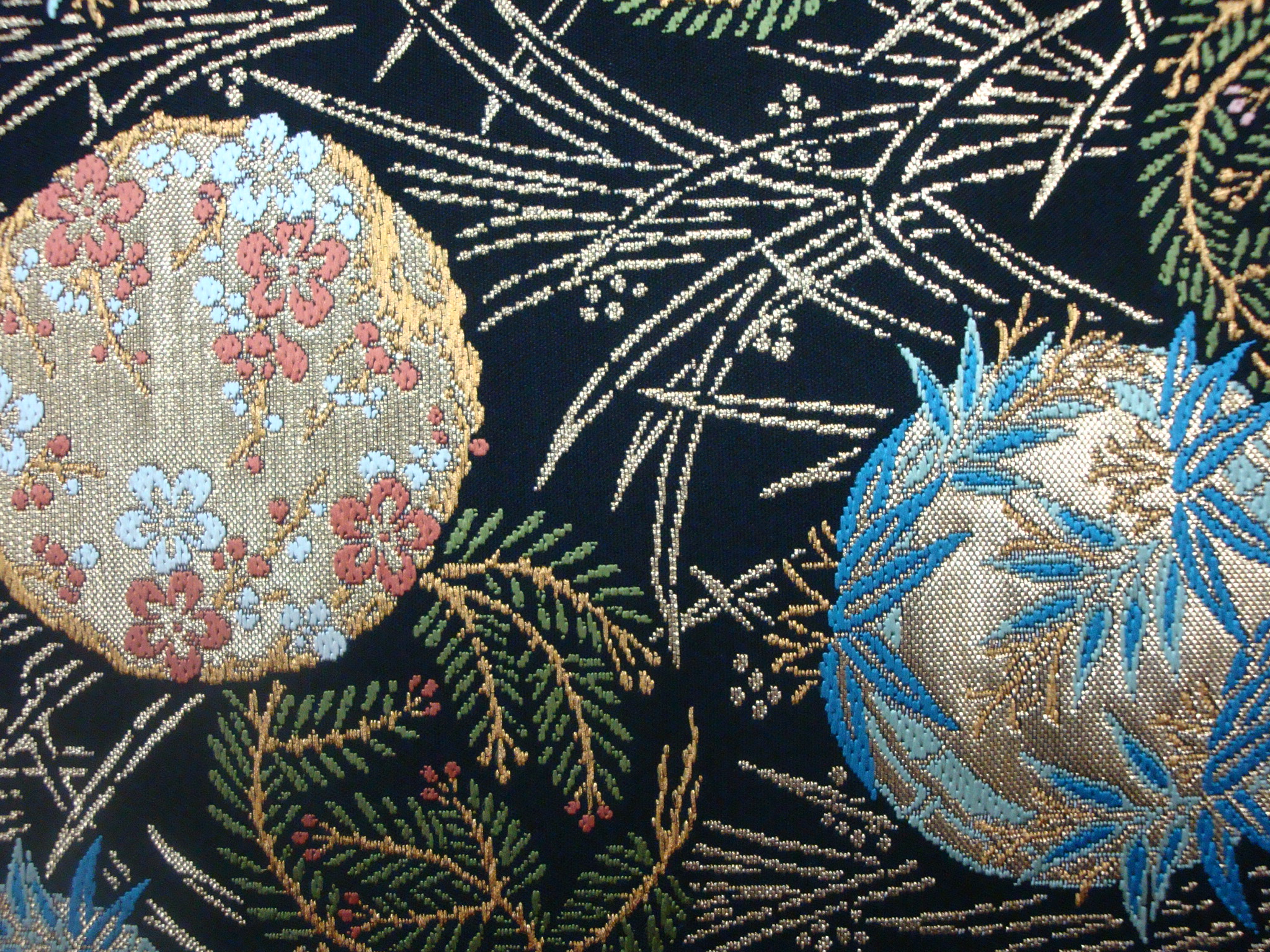 (黒地 松竹梅彩香文 錦袋帯・龍村美術織物)