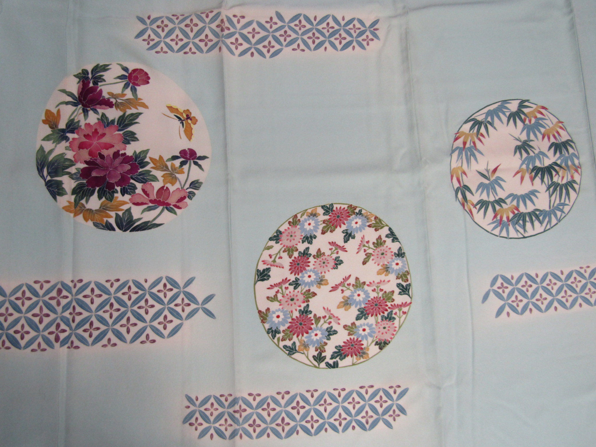 独特の感性で意匠を描いた友禅作家・品川恭子さんは、花の丸文様を得意としており、様々な形式の図案を描いた。この訪問着の花の丸は、和花の丸と正倉院的な唐花の丸、二つの異なる性質の花の丸を併用して模様を構成している。図案を見れば、どの花の丸も個性的で美しいデザインが施され、一目で「品川作品」と判る。キモノや帯の柄としては、和花と唐花が並び立つことはほとんど無いが、この花の丸は見事に融合している。これは、品川恭子という作家の優れたデザイン力が、和花と唐花の垣根を取り払ってしまったのである。