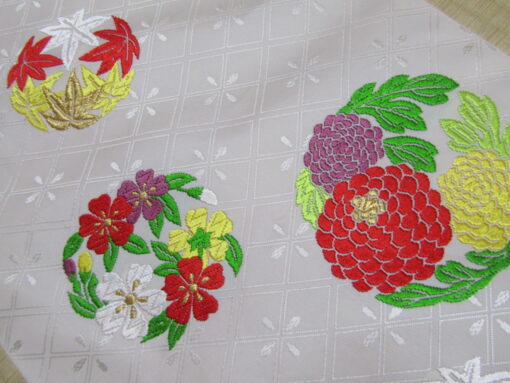 舞妓さんが使う「だらり帯」仕様になっている、帯丈の長い七歳用の祝帯。花の丸文に限らず、子ども用の祝帯には、鈴や手鞠など丸い形の玩具や楽器をモチーフに採ることが多い。丸い文様にはその形状から、どことなく可愛さや優しさが感じられるからだ。この帯の花の丸は、桜と菊と楓がモチーフ。赤・黄・緑・紫・白の五色を上手く使って、鮮やかな花の丸に仕上げている。唐織帯なので、花姿が地から浮き上がり、立体感あふれる文様姿になっている。