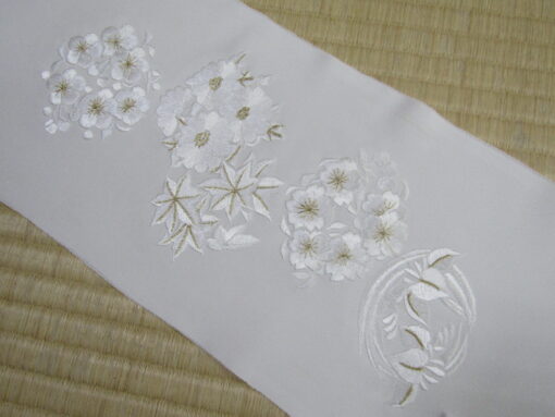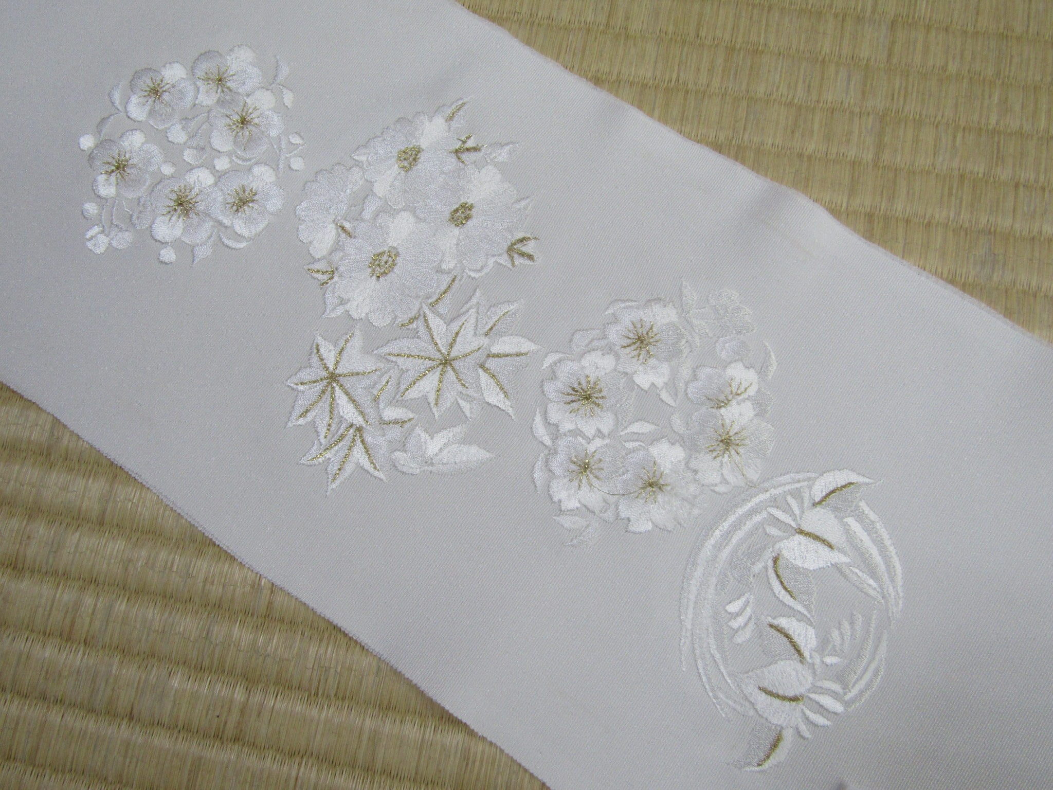 (白地 桜・楓・菊花の丸文様 祝着用丈二帯・奥田織物)