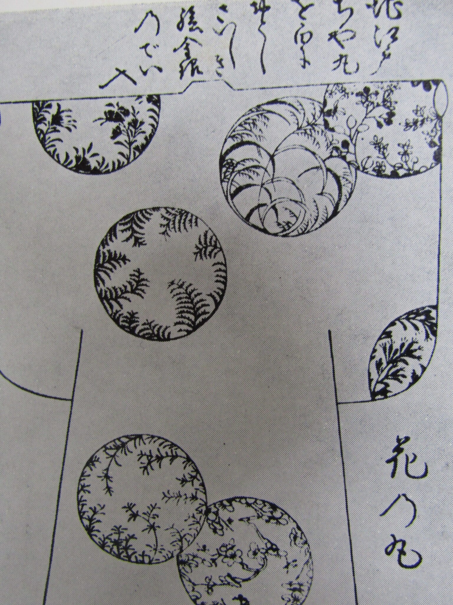 1688(貞亨5)年に刊行された都今様友禅ひいながたには、模様染として友禅の技術が確立された当時の小袖意匠が、多数掲載されている。その中心となった模様が、上のような花の丸文である。他に刊行された図案書にも、花をモチーフにした丸文は多く描かれ、この時代に最も流行していた図案であったと理解される。