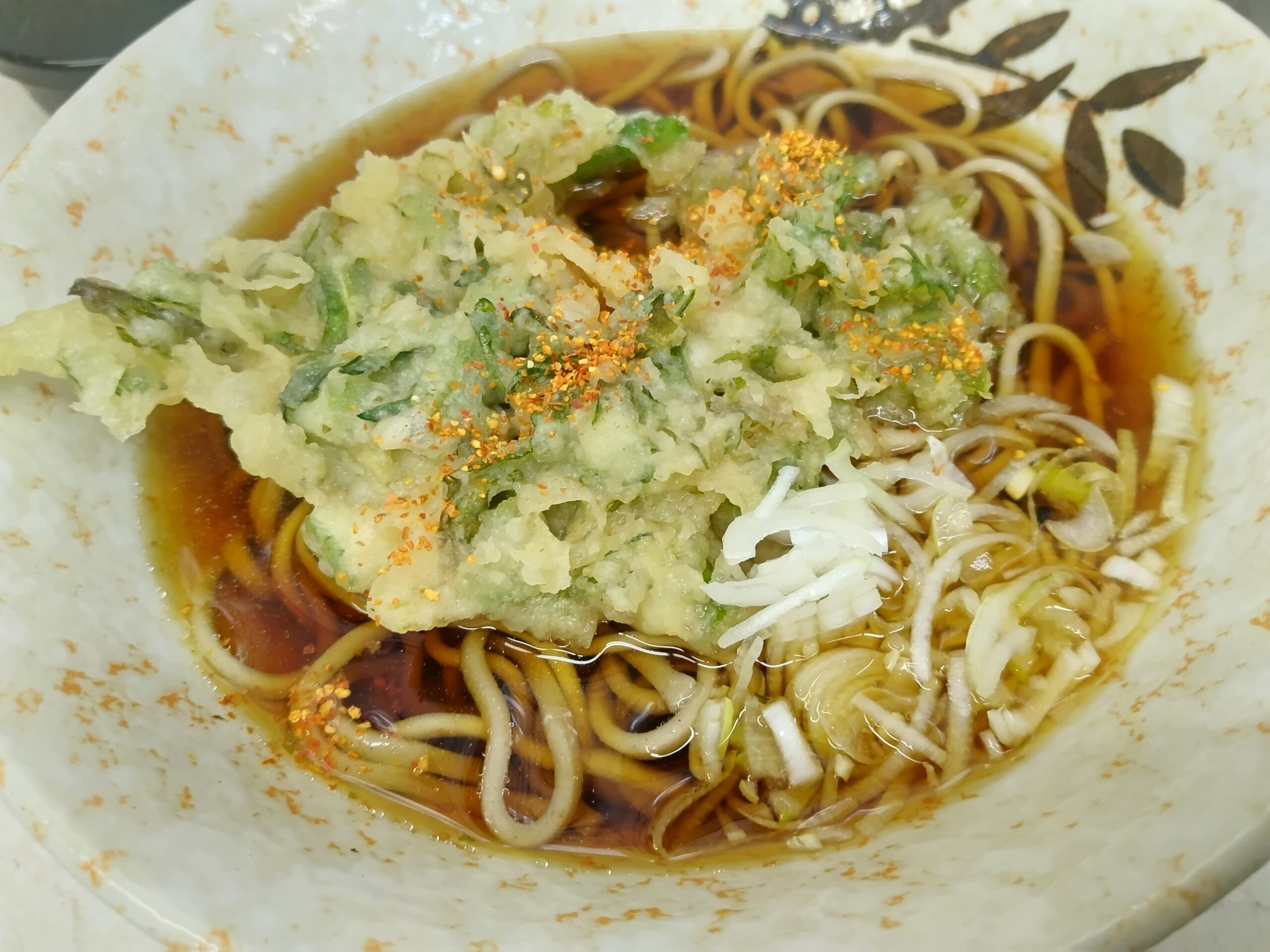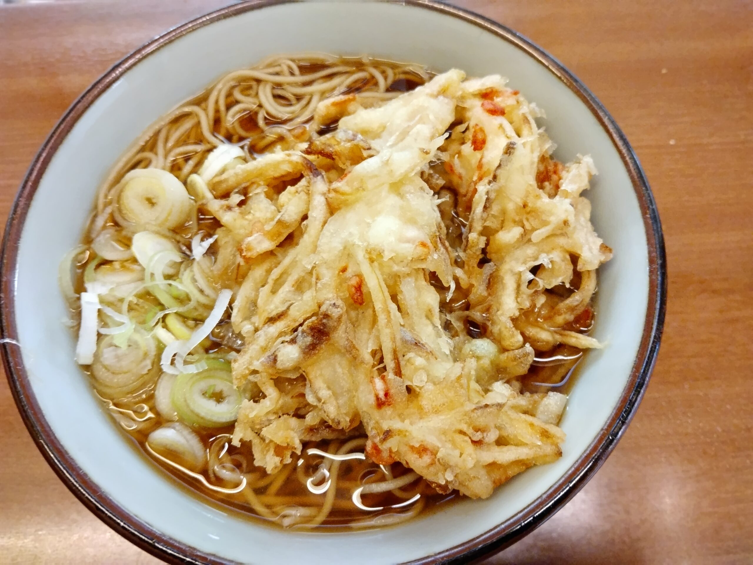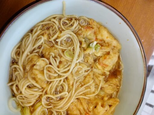 この日は朝の電車の中で、食べるなら春菊天そばと決めていたのだが、券売機に売り切れの赤ランプが付いている。まだ朝10時前なので、おそらく売り切れではなく、この日は春菊が入荷しなかったのだろう。仕方ない、少しがっかりしながら、かき揚げソバ(500円)のボタンを押す。