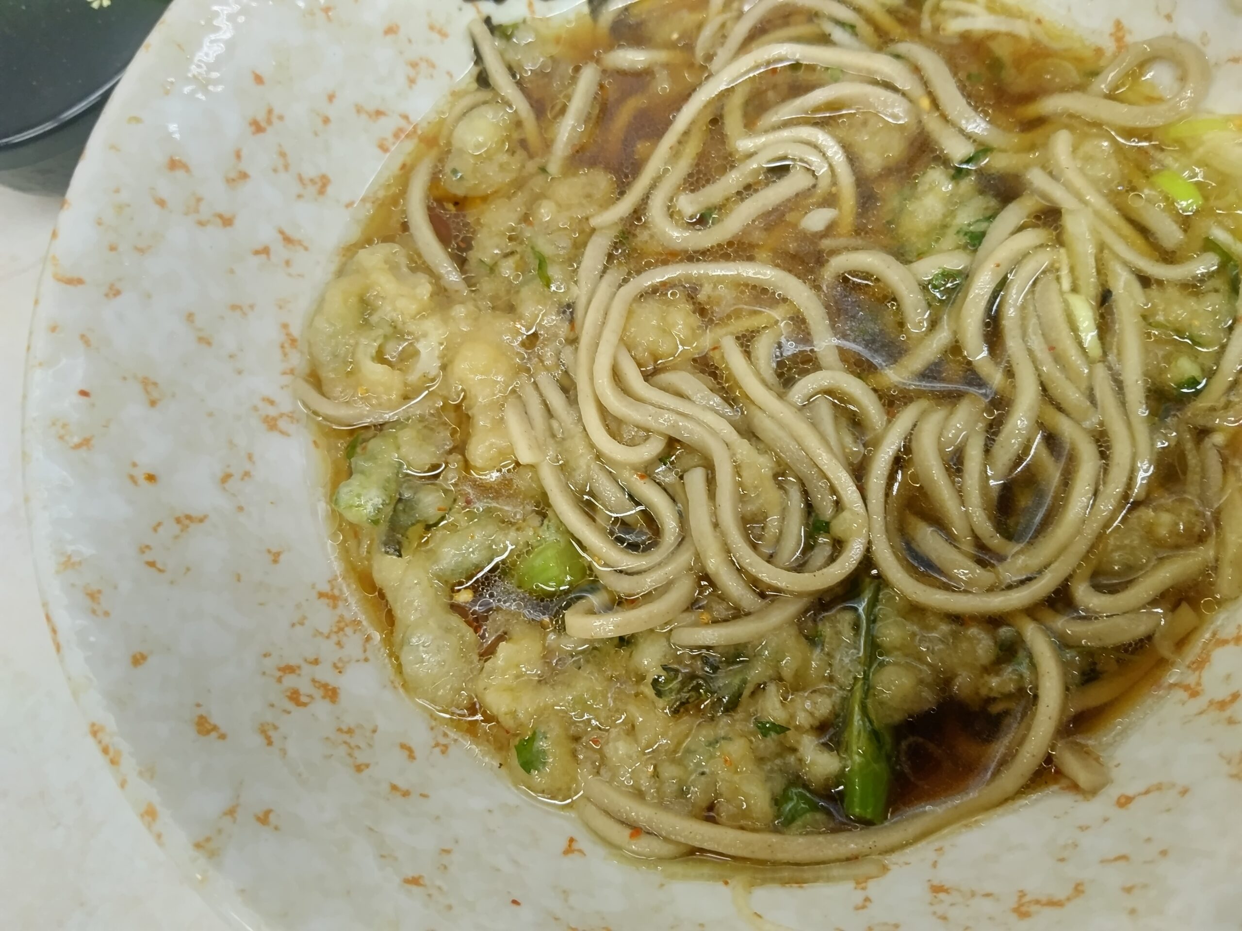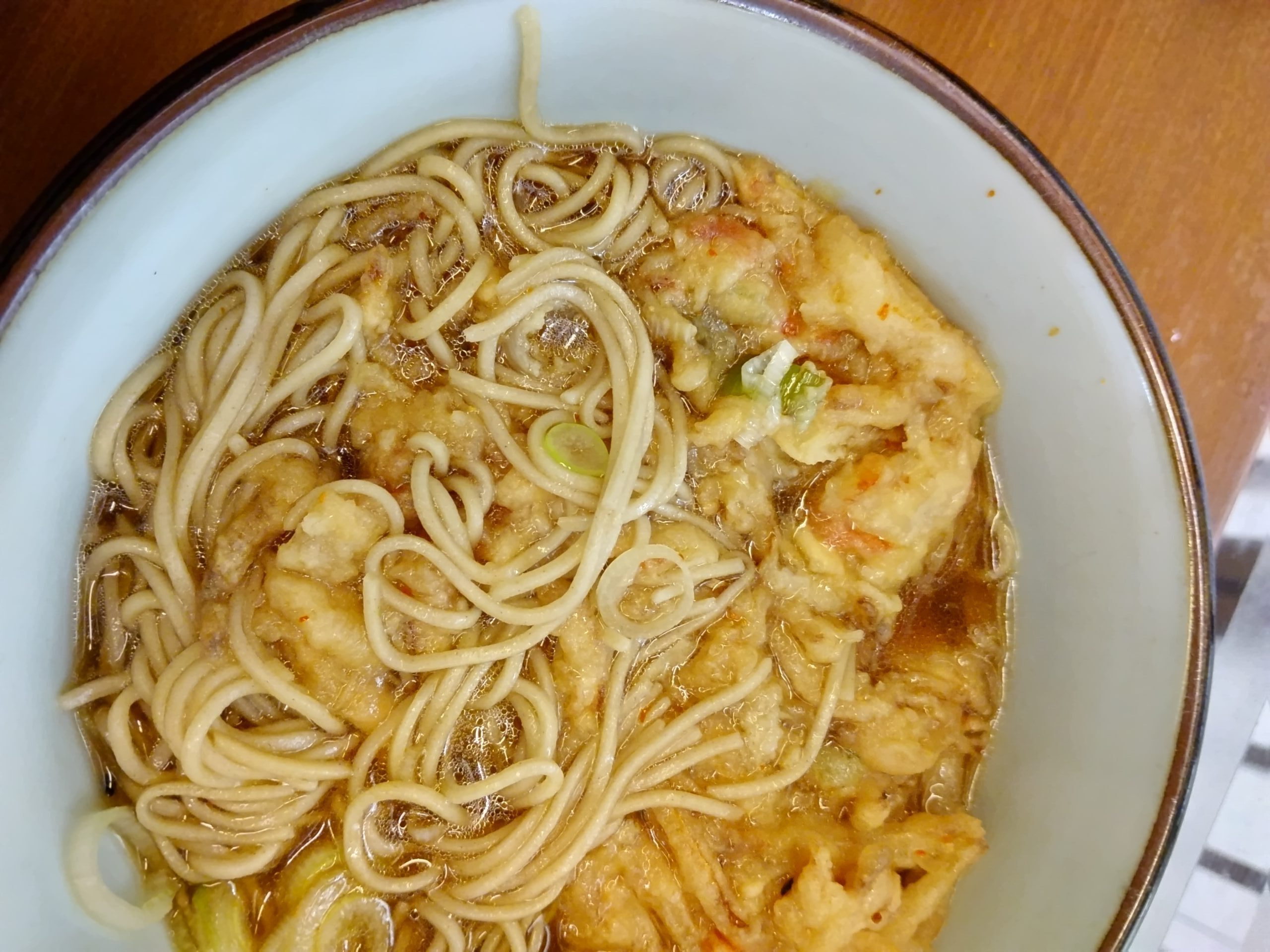 天ぷらは予め揚げて置いたものだが、ご覧の通り衣が薄い。麺も十分な量があり、ズシリと丼が重い。この日は3月初めの寒い日だったが、体の芯から温まりそうな一杯。