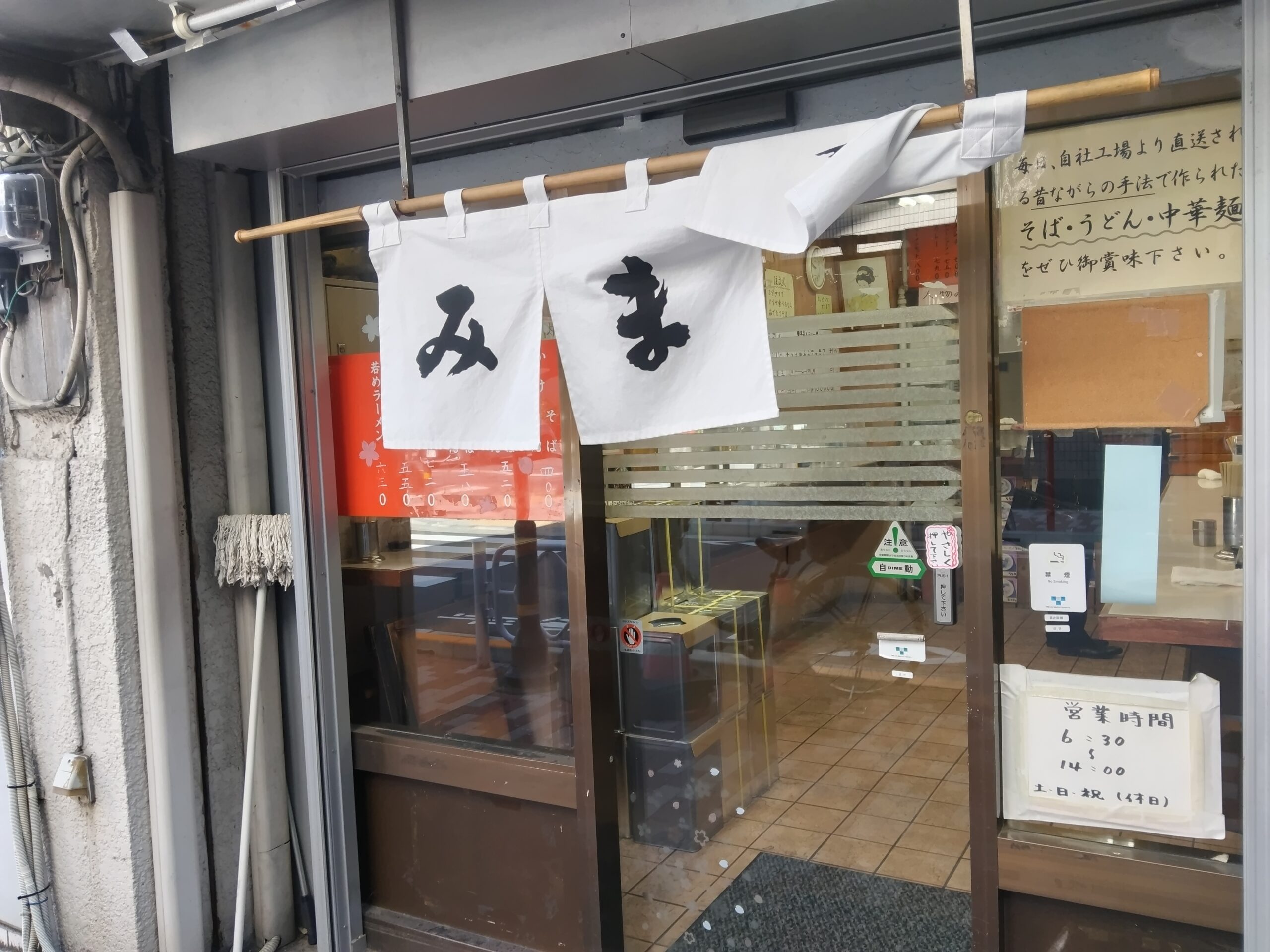 来た時と同じように、馬喰横山駅のA3入り口から改札に向かうが、駅前の清州橋通りを渡るところに、信号がある。たまたま赤信号だったので立ち止まると、横の立ソバ屋・みまつがまだ暖簾を下げている。ここは午後2時と早く閉店するので、あまり入る機会が無い。ふと朝の電車の中で、春菊天ソバを食べようと考えていたことを思い出した。そういえば、昼飯の量が足りていなかったことだし。信号から回れ右をして、迷うことなく、風にそよぐ白い暖簾をくぐる。