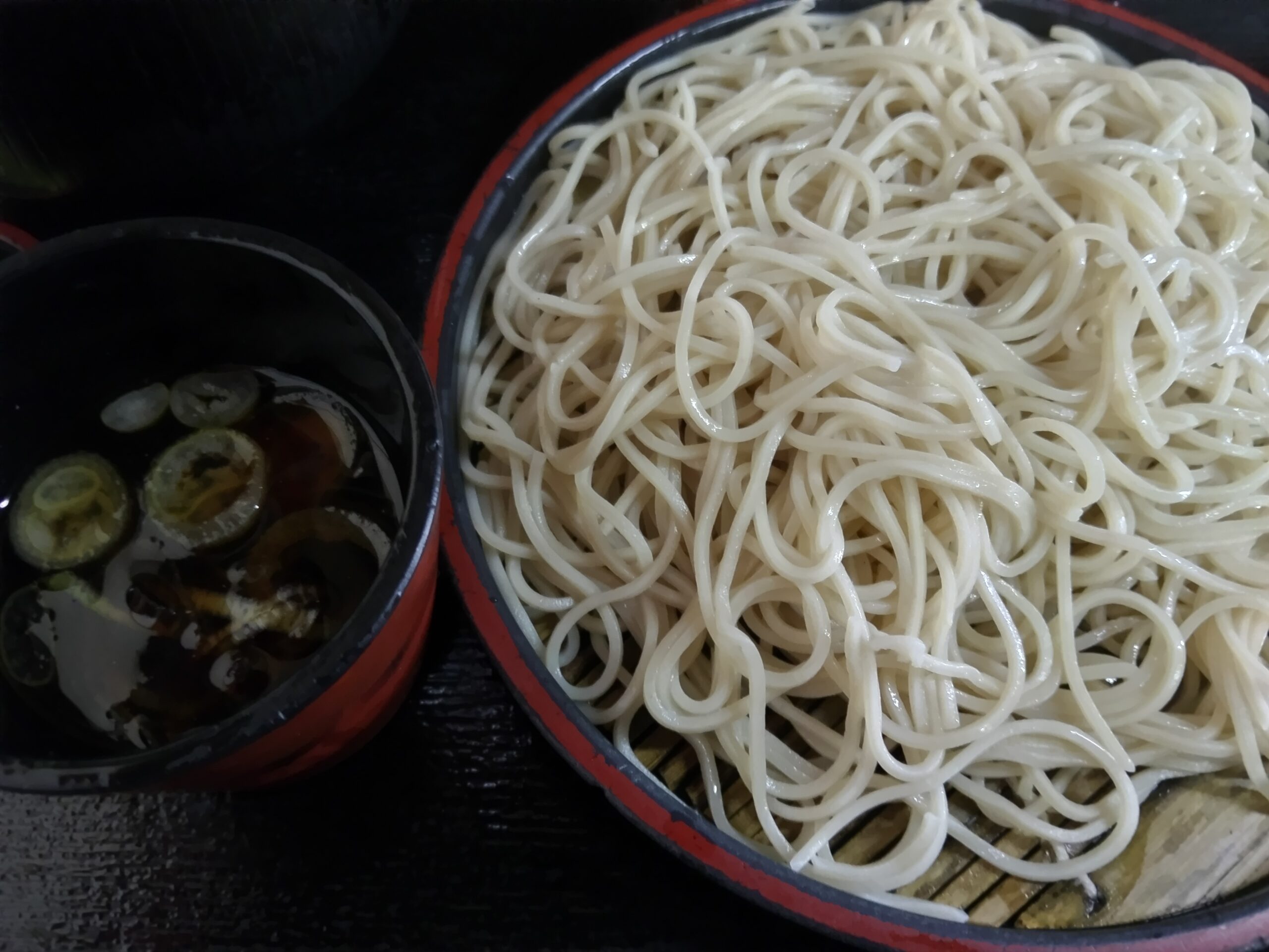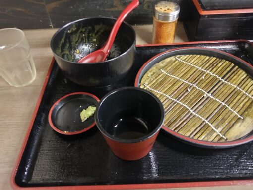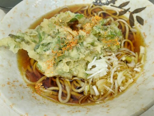 みまつの麺は、文殊やあり賀せいろうと比べると、少し太い。そして茹で方も柔らかく、ふにゃっとしている。だが、生めんを湯に通しただけの「ふにゃ感」こそが、立ソバの特徴で、これはこれで良い。ツユは少し甘め。春菊の天ぷらは葉を刻んで揚げたもので、衣が柔らかい。ほろ苦い春菊は、一番ソバに合う野菜だ。