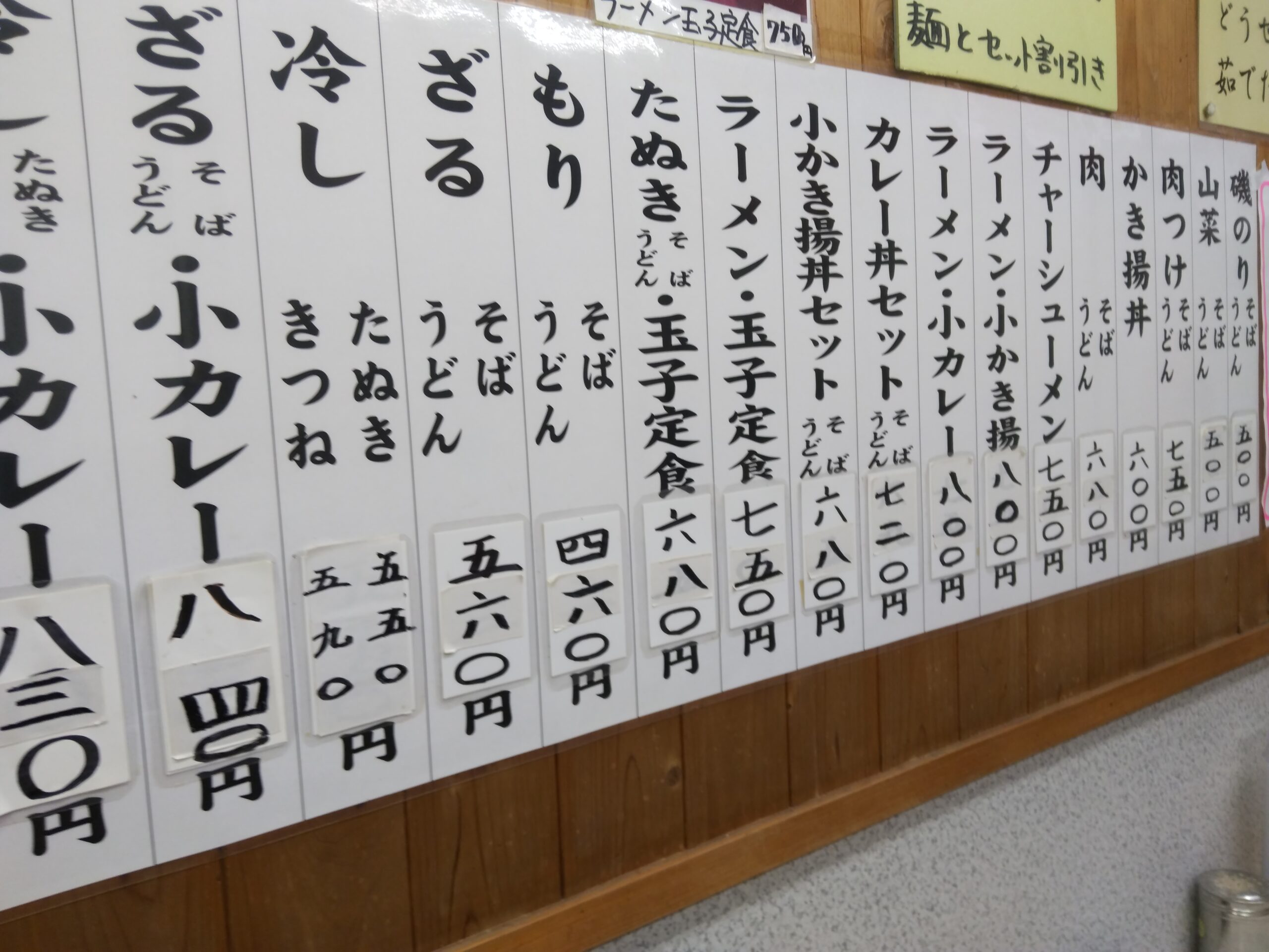 壁一面に貼られているメニュー。カレーやかき揚げ丼のセットでも800円までで、実に財布に優しいお値段。磯のりそばとかしいたけそばなど、他にはあまり見られないトッピングもある。券売機ではなく、直接厨房にいるお姉さんに注文する方式。世の中タブレットやタッチパネルを使う店が多くなったが、これこそ正しい店のあり方だろう。