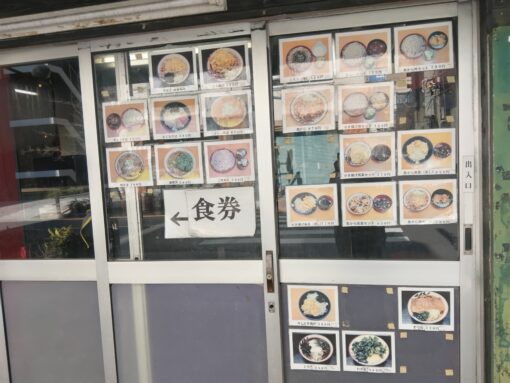 あり賀せいろうが開店したのは、2014(平成26)年なので、もう12年も前になる。古びたサッシがなかなかいい味を出しているが、この建物が以前何だったのか全く記憶が無い。店には入り口が二つあり、左側の扉を開けると食券販売機がある。混んでいる時には、食券をカウンターの上に出して、外で順番を待つ。店内にはコの字型にカウンターがあり、椅子が8席置かれている。立ちソバの風情だが、実は座って食べる店なのだ。
