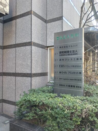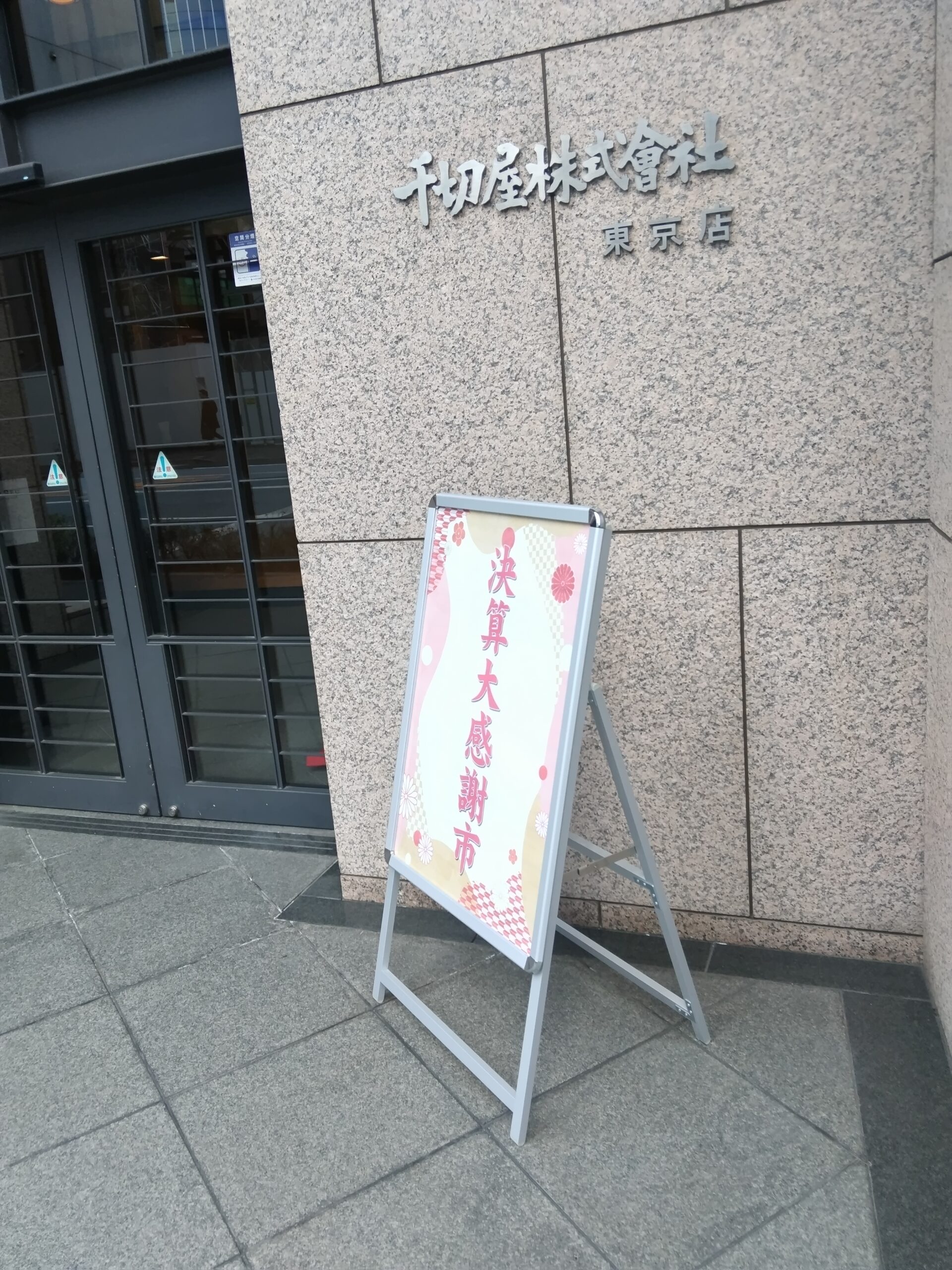日本橋にほど近い室町の千切屋までは、かなり時間がかかる。人形町駅のある交差点から、金座通りを西へと歩き、首都高速の高架下を越えて70mほど。日本橋北詰交差点のすぐそばに、立派なビルが建っている。上の画像は、その玄関先。