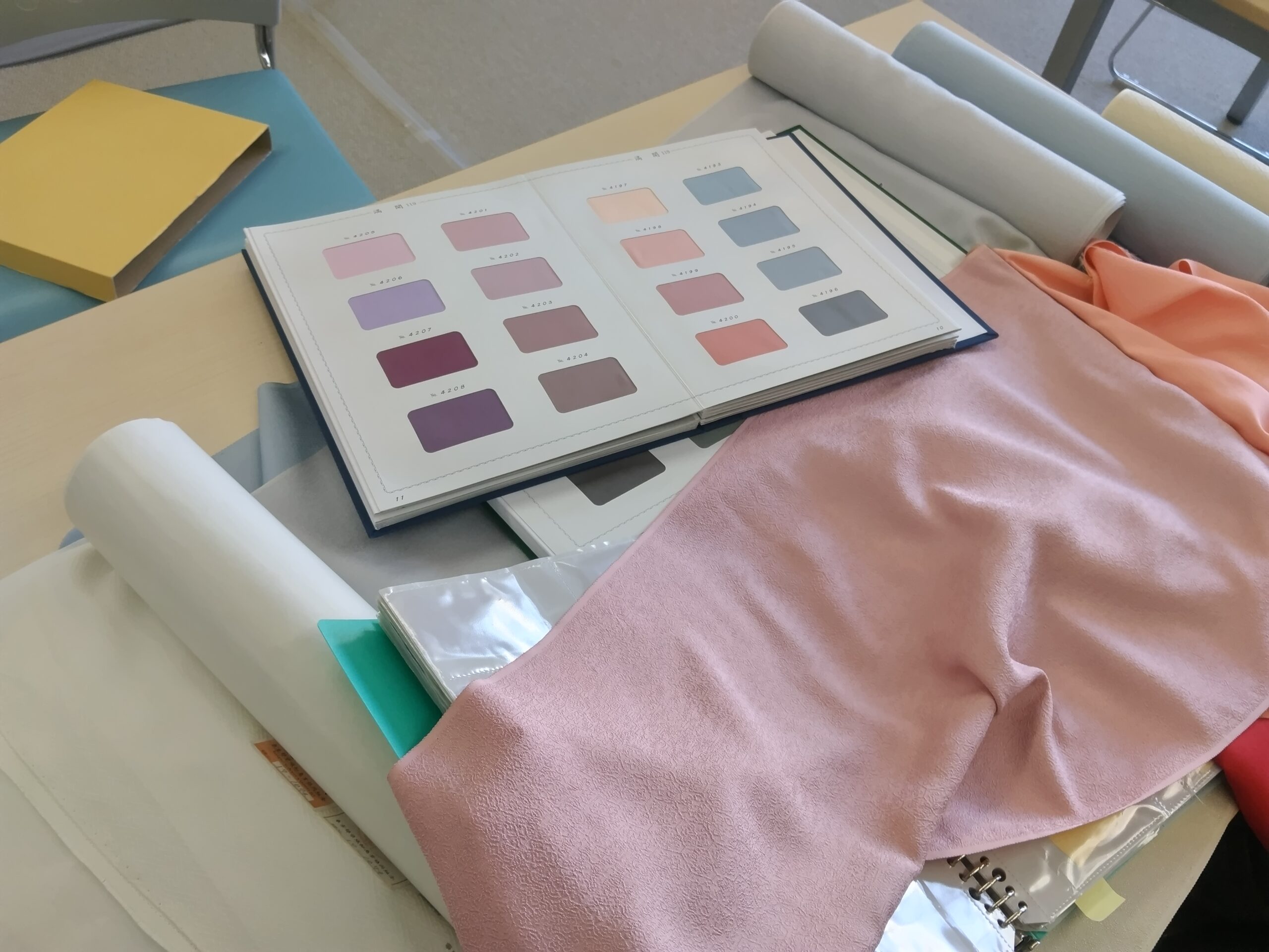 この日は、すでに出来上がっている付下げと同じ意匠で、地色違いの品物を誂える相談。机の上には、使う白生地と色見本帳を広げている。ローズ系の色を依頼しようと考えてきたが、生地の地紋との兼ね合いもあって、なかなか決まらない。これは、お客様が色無地を誂える時に、生地と色で悩むのと同じ。それでも相談する相手は、菱一の頃から気心が知れている社員なので、私の好みは十分把握している。こういう時に、長い付き合いが生きてくる。