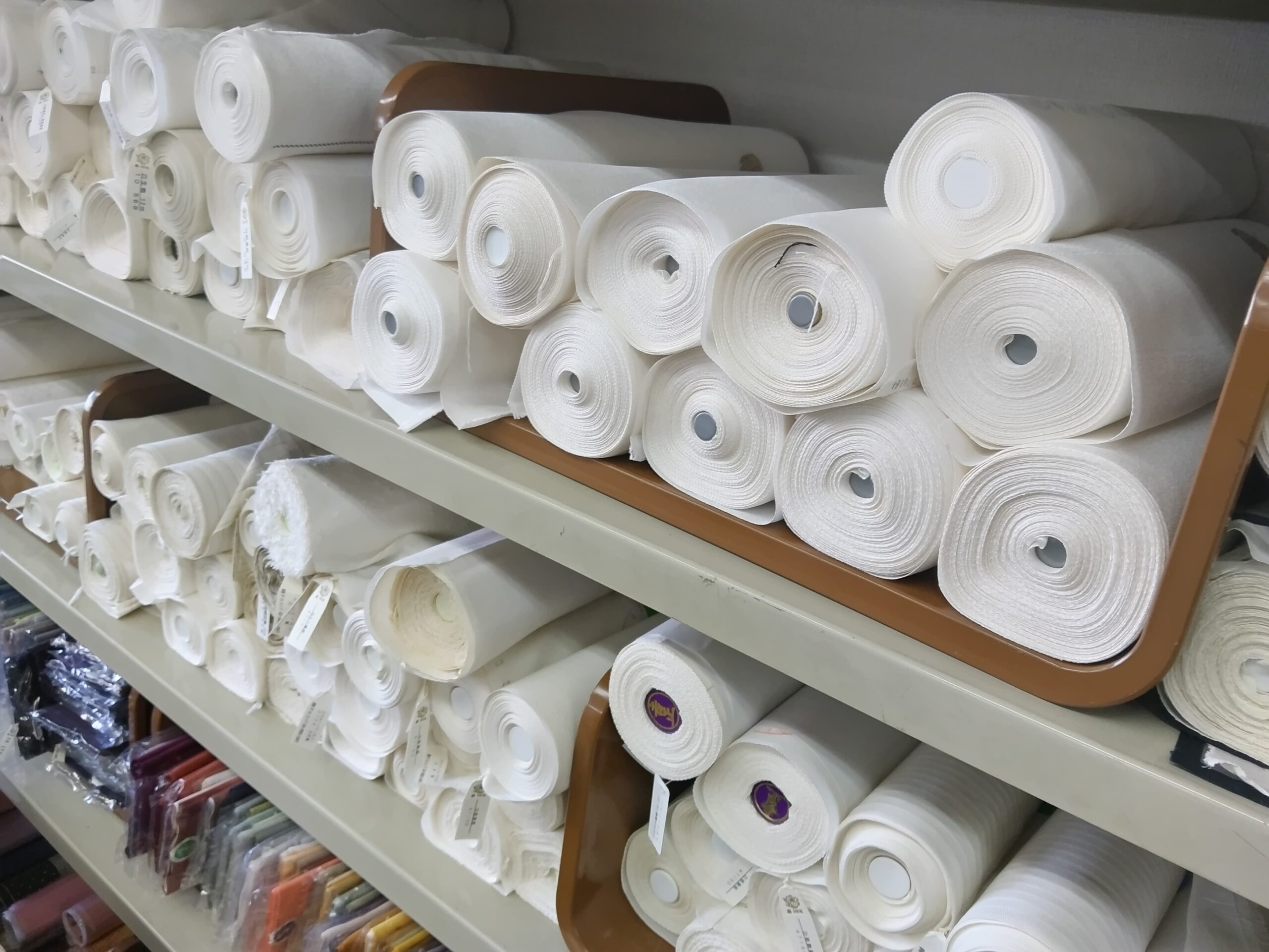 棚にずらりと並んでいる白生地。様々な図案の紋織生地があり、一越系にも多様な生地がある。着尺用には3丈、4丈、振袖用などがあり、帯用の塩瀬生地もある。また完成した生地ばかりではなく、生地見本も沢山置いてあり、その中から選んで織ってもらうことも出来る。