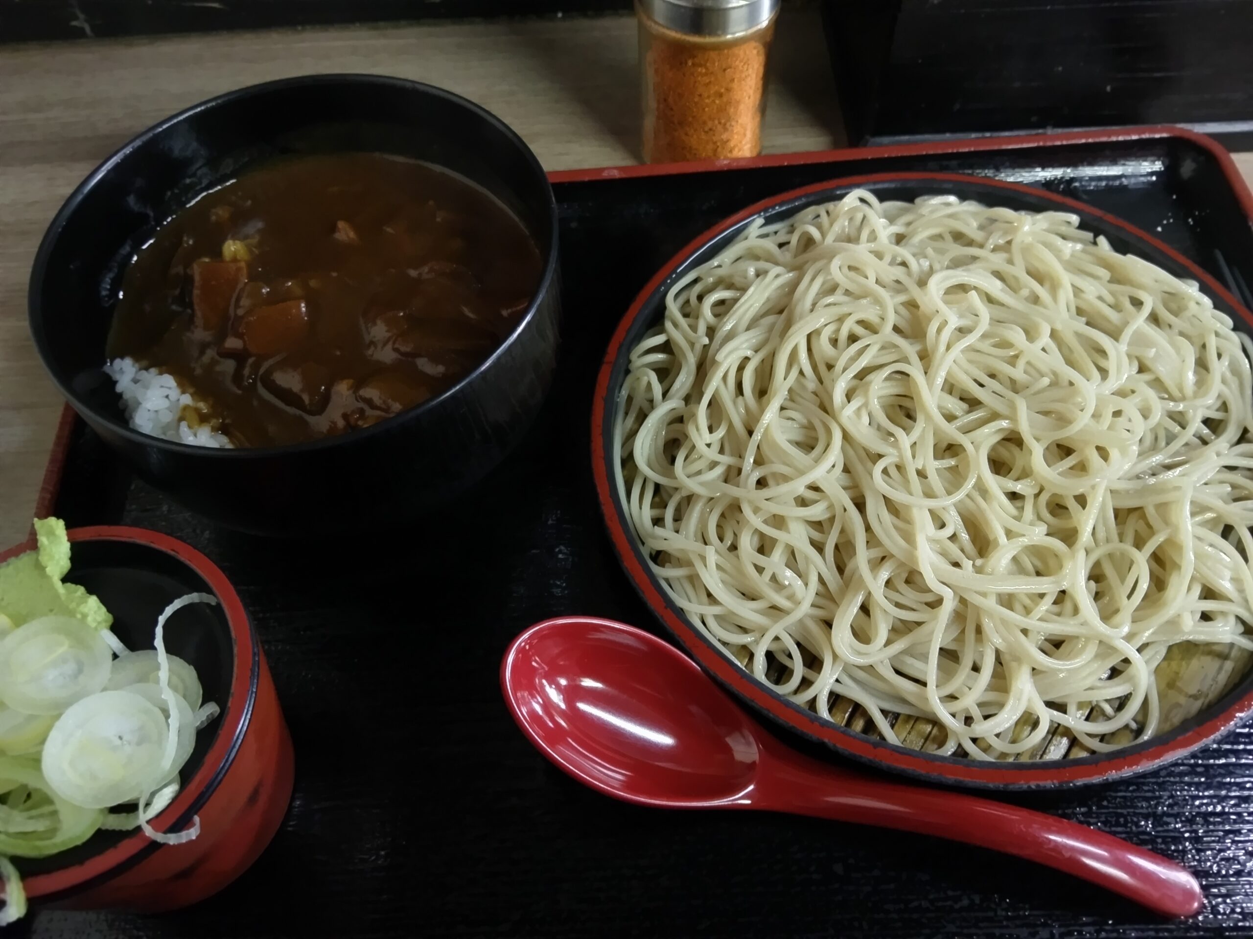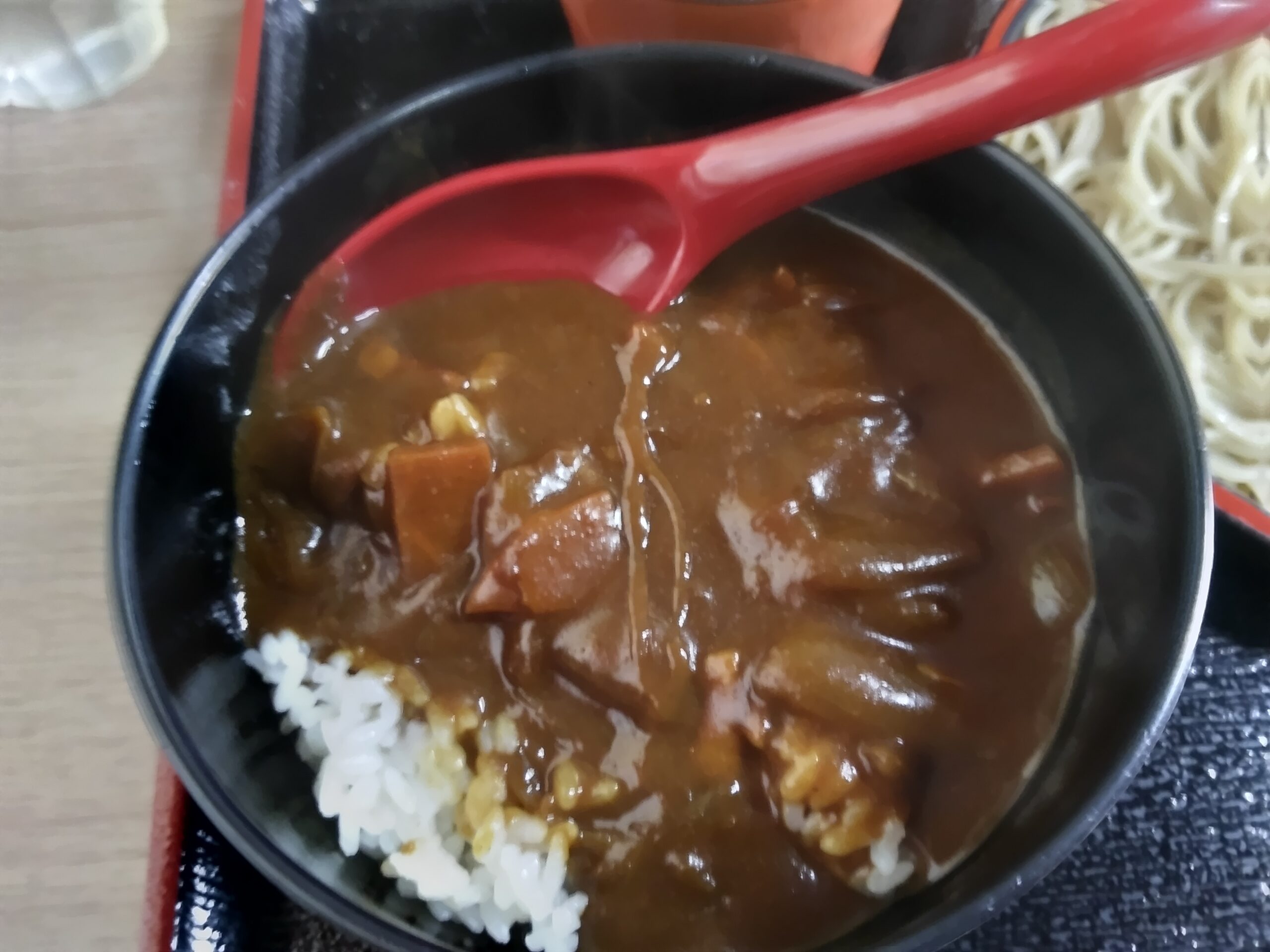少しドロっとした色の濃いカレー。玉ねぎやニンジン、豚肉も沢山入っている。立ソバ屋のカレーは具が少ないものだが、ここは違う。見た目には辛そうに見えるが、それほどでもない。コクがあって深い味わい。セットのカレーと言っても、量はしっかりあって、食べ応えがある。よくある「そば屋さんのカレー」とは一線を画し、どちらかと言えば家庭的な味。