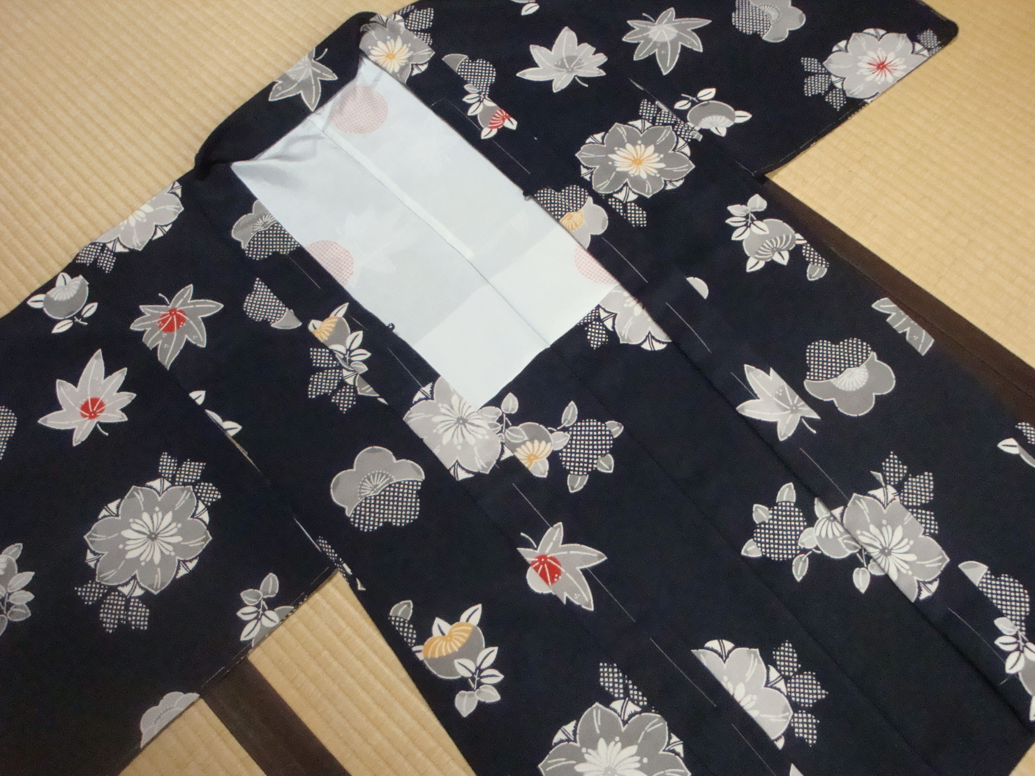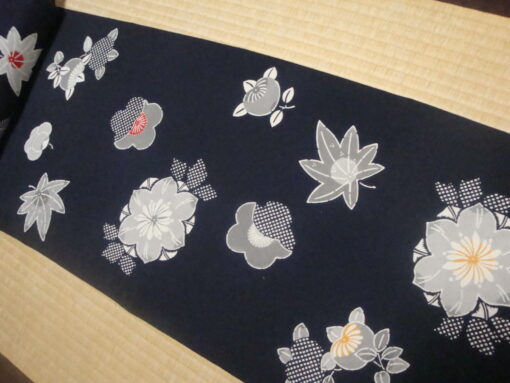 シボの大きいちりめん生地を使い、深い群青地に鉄線・楓・橘・梅をバランスよく散りばめている。これは、菱一が考えた図案を、そのまま栗山工房が型を起こして染めた小紋。栗山では自分の工房で独自に型を起こし、様々な小紋や染帯を作っているが、こうした問屋依頼の誂え品の仕事も受けていた。
