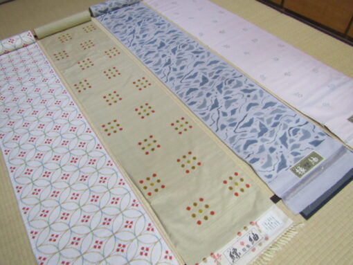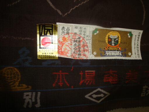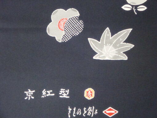 菱一のオリジナル品は紬に止まらず、小紋でも様々な品物を扱った。自分のところで模様を考え、地色や挿し色を決めて、職人に発注する。小紋の場合、一つの柄に対して地色を3~5色くらい変えて染め出しをしていた。そして上の品物のような、型染紅型でもオリジナル図案の品物を作った。誂えを依頼した先は、京紅型の製作としてよく知られている栗山吉三郎工房。反物の端には、栗山工房の「亀甲に吉」のロゴと、菱一が社是として掲げていた「キモノを創る」の文字が並んで染め抜かれている。