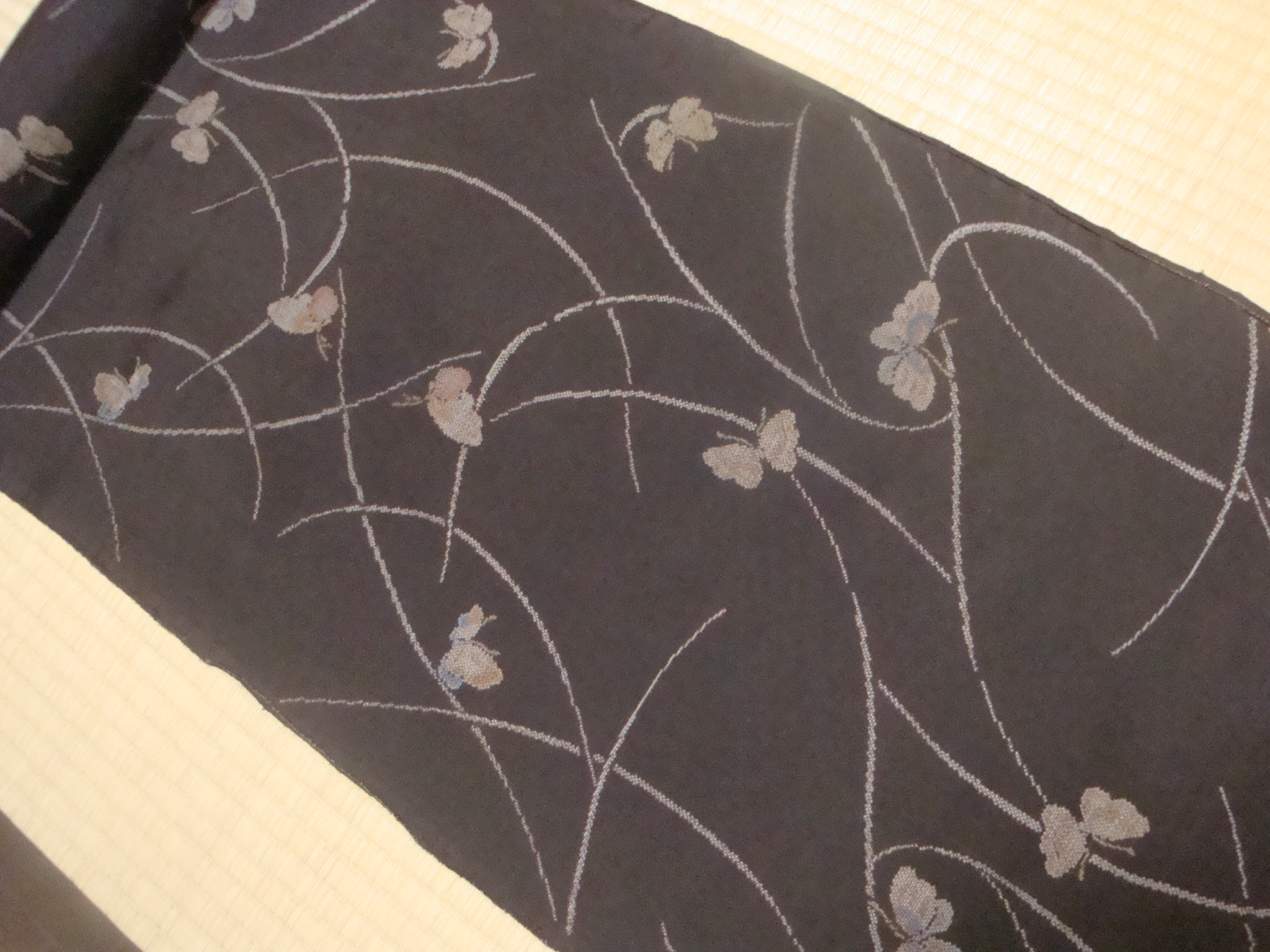 黒に近い深紫・檳榔樹色で地を染めた珍しい大島。露芝の中に蝶が舞う絣模様は、紬意匠としては動きのある図案。模様が密ではなく、地空き部分が多いのも特徴である。最初の重ねた椿図案やこの地空き図案を見ると、どこか「小紋的な発想」があるように思える。モチーフにした植物をデザイン化して意匠にしたり、植物と蝶をとり合わせて写実的な模様にする。当時の菱一は、オリジナル小紋も作っており、大羊居や大松など手描き友禅も多く扱っていたので、模様や図案、あるいは挿し色など意匠に長けた社員が何人もいた。こうした商品開発や仕入れを行う、いわば染織品のオーソリティと言える者が社内にいることが、一流のメーカー問屋として存在出来る大きな条件であった。
